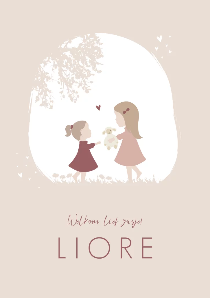 Het Uilennestje x Happy Horse. Een lief geïllustreerd geboortekaartje van een grote zus met haar zusje met als toevoeging een Happy Horse knuffel. Wil je liever een andere knuffel of andere kindjes op de kaartje Liore? Neem dan een kijkje in onze editor voor de vele opties!