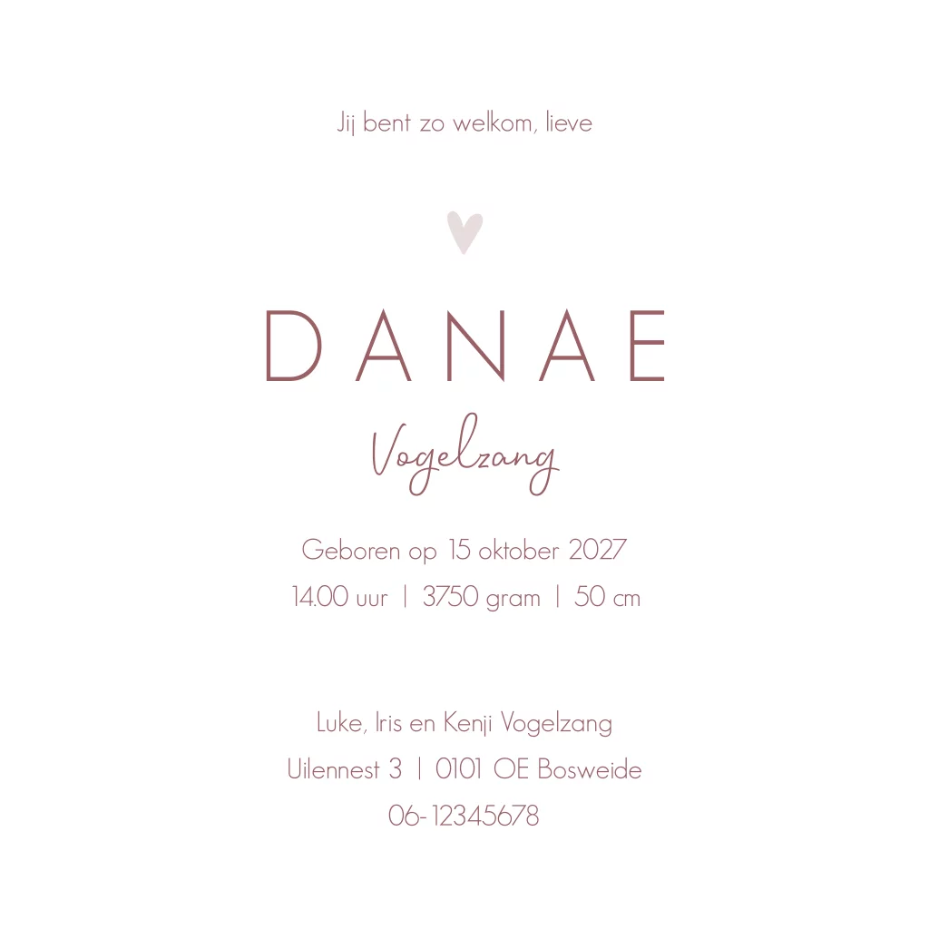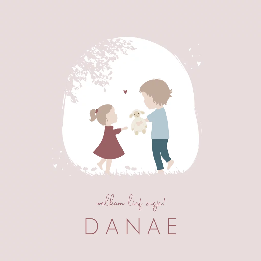 Het Uilennestje x Happy Horse. Een lief roze geïllustreerd geboortekaartje van een grote broer met zusje met als toevoeging een Happy Horse knuffel. Wil je graag iets aanpassen aan kaartje Danae? Neem dan een kijkje in onze beeldbank voor alle opties. Mis je nog iets? Neem dan contact met ons op en we helpen je graag verder!