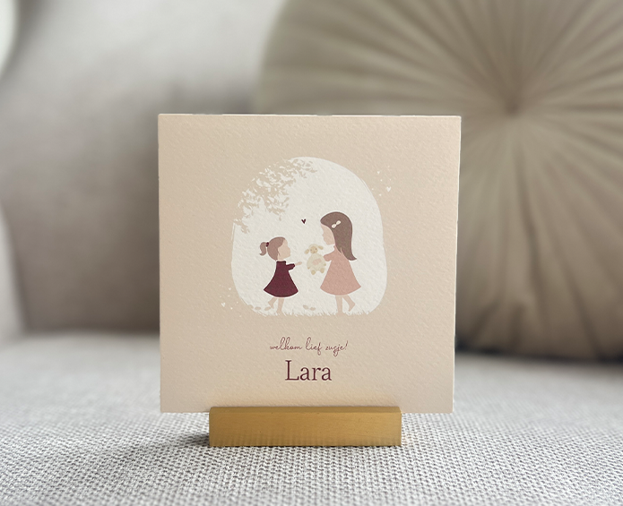 Het Uilennestje x Happy Horse. Een lief beige geïllustreerd geboortekaartje van een grote zus met zusje met als toevoeging een Happy Horse knuffel. Wil je graag iets aanpassen aan kaartje Fiore? Neem dan een kijkje in onze beeldbank voor alle opties. Mis je nog iets? Neem dan contact met ons op en we helpen je graag verder!