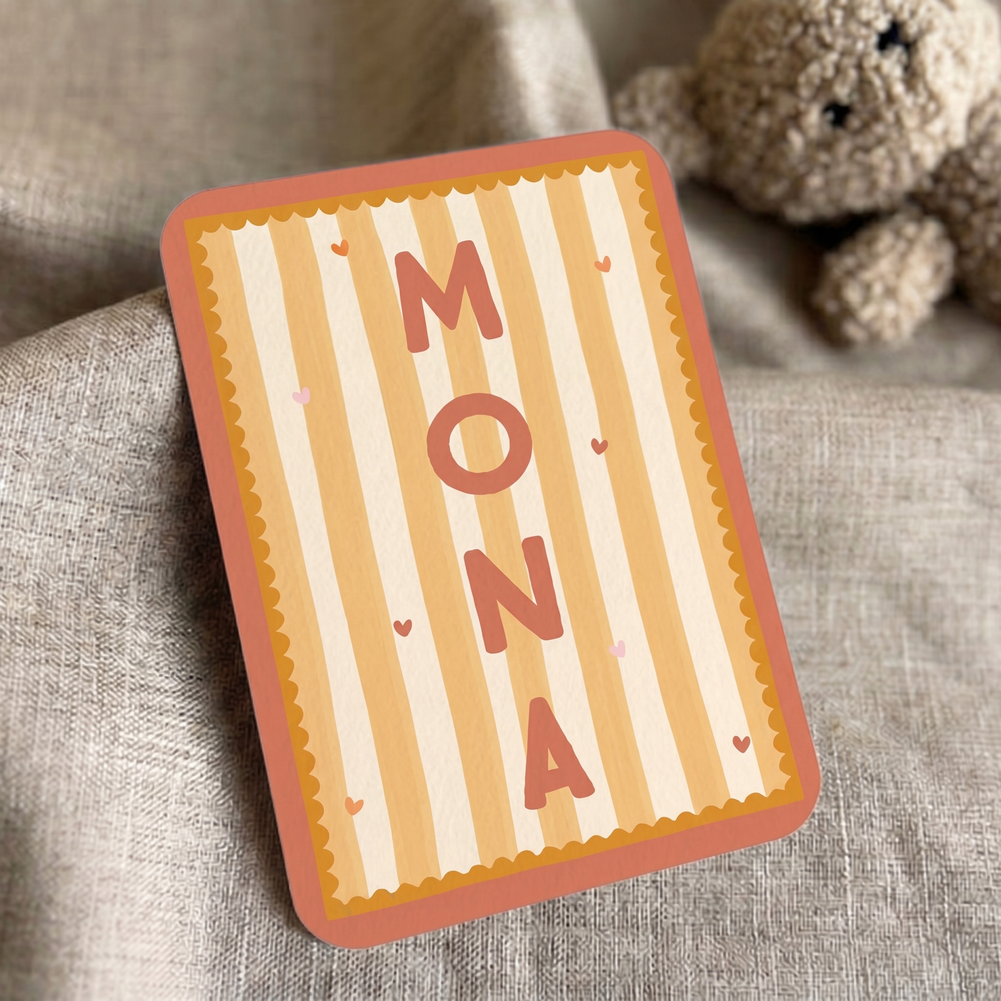Dit geboortekaartje is een heus feestje! De gekleurde hartjes, strepen, boogjes en de frisse kleuren zorgen voor een vrolijk, eclectisch geboortekaartje. De kleuren op kaartje Mona pas je gemakkelijk naar wens aan.