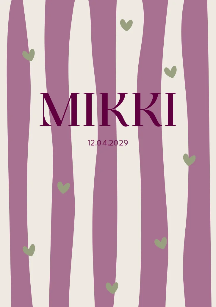 Een stoere beige en paars gestreept geboortekaartje Mikki met groene hartjes.