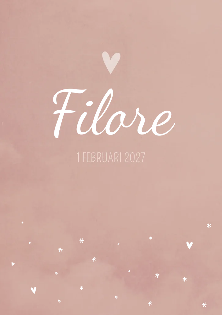 Roze gewolkt geboortekaartje met geïllustreerde hartjes en sterretjes. Geboortekaartje Filore is super mooi met koperfolie. Liever goudfolie of een ander kleur? Je past de kleur, opmaak en het lettertype van dit kaartje eenvoudig aan in de editor.