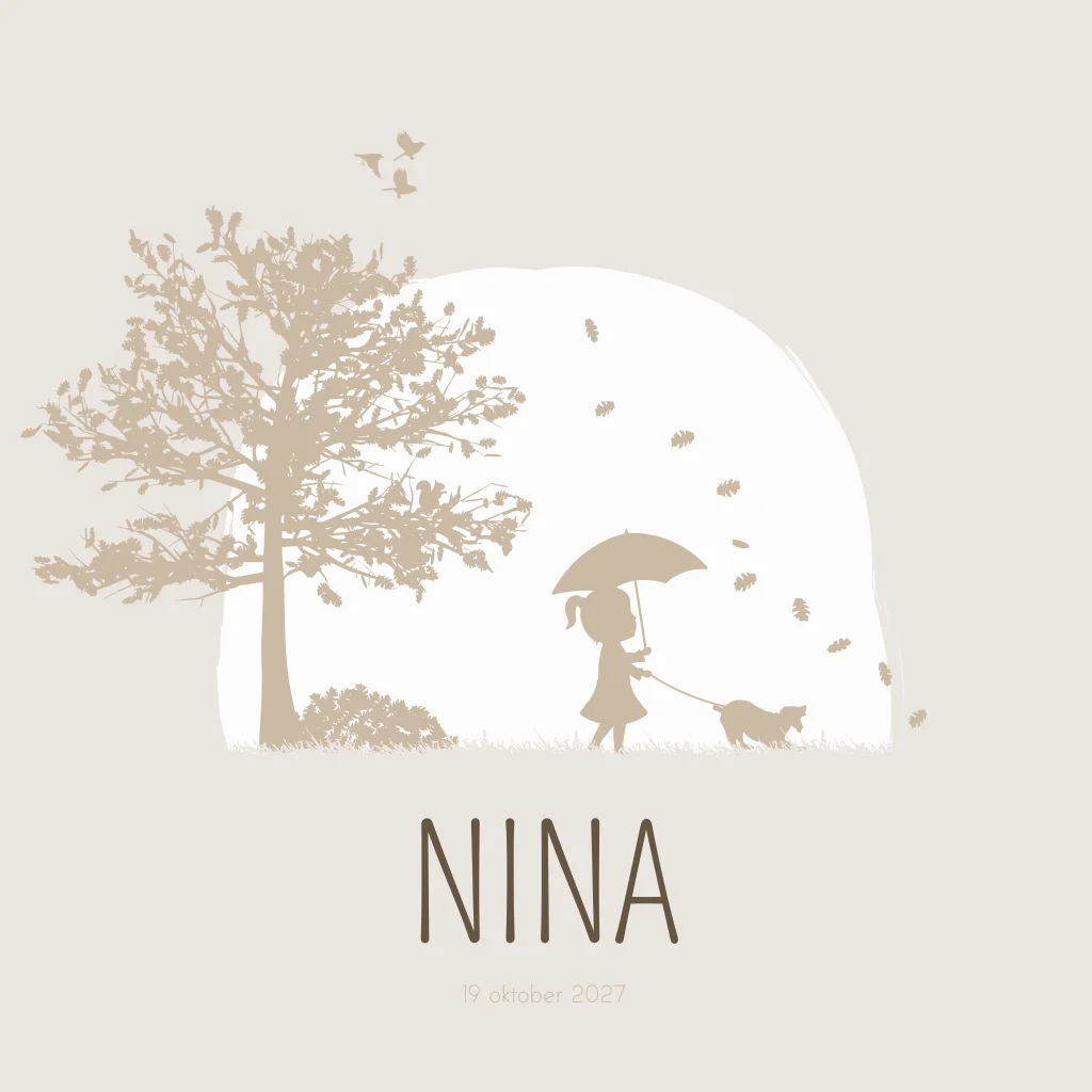 Een beige illustratie kaartje met een silhouet van een meisje onder een paraplu. Ze laat haar hond uit in een herfstig tafereel waarbij de bladeren van de boom valt. De hond speelt met de blaadjes. Verder staan op kaartje Nina vogeltjes, een eekhoorntje en een konijntje. Wil je graag iets aanpassen? Neem dan een kijkje in onze editor voor de vele opties!