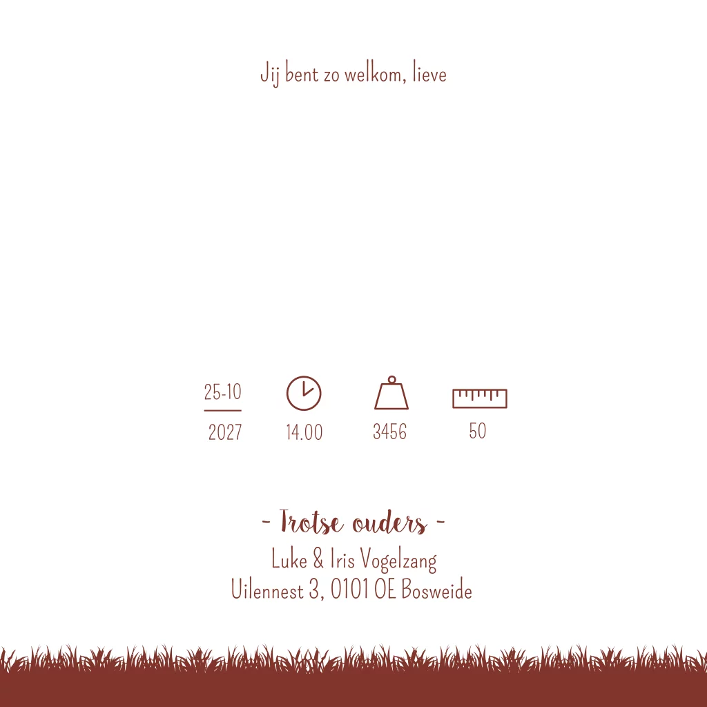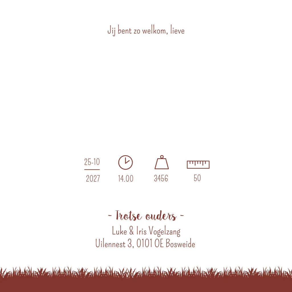 Een roestbruin bordeaux rood geboortekaartje met een meisje dat een paardenbloem wegblaast. Onder de boom staat een hondje. Geboortekaartje Nouk is een illustratie kaartje waarbij je de illustraties eenvoudig zelf kunt aanpassen in de editor. Zo kan je bijvoorbeeld extra dieren toevoegen of de hond vervangen voor een ander dier. Kom je er zelf niet uit? Neem gerust contact met ons op, we helpen je graag.