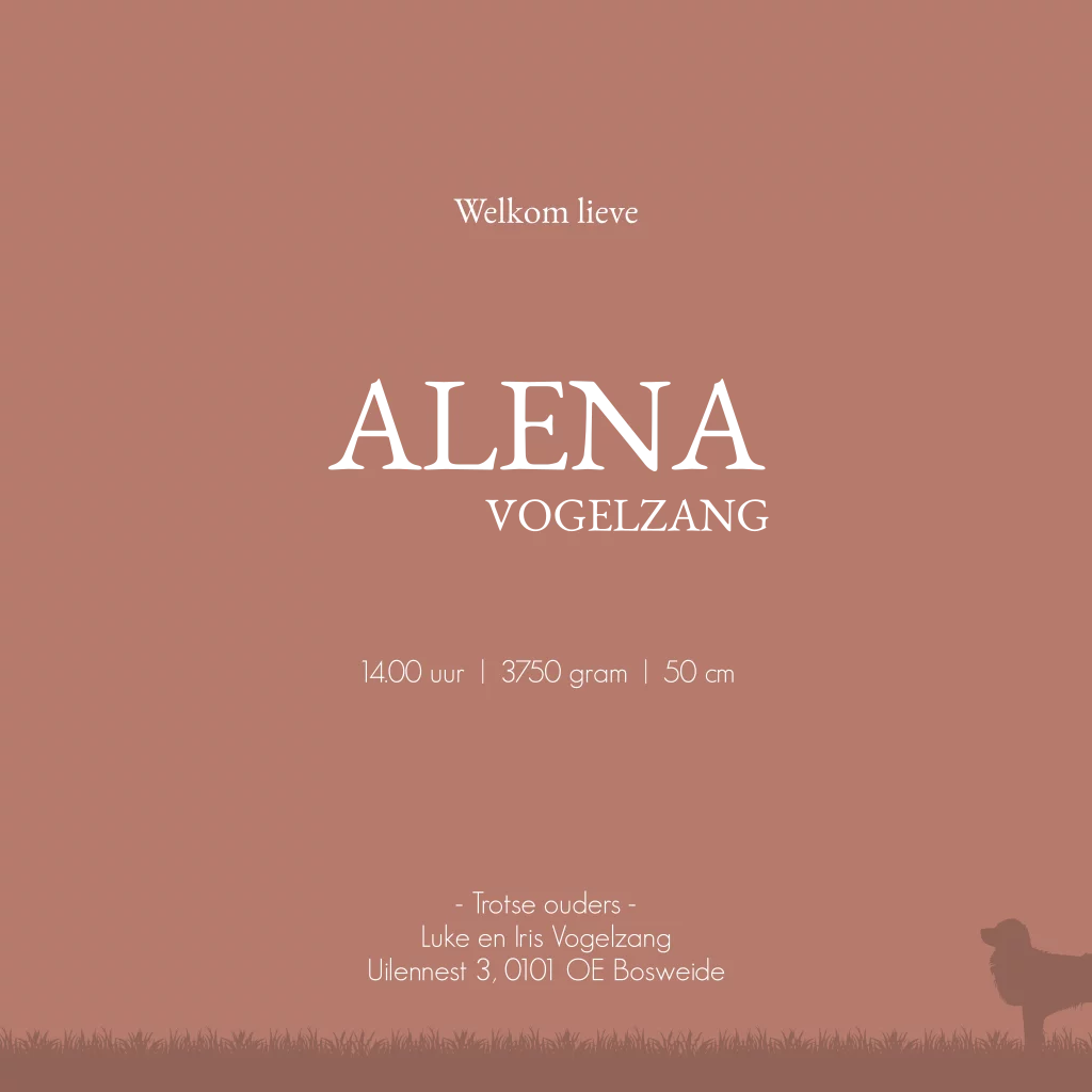 Een lief oudroze geboortekaartje met gouden letters en een meisje die haar hond uitlaat. Kaartje Alena is volledig aan te passen naar jouw gezinssituatie zodat zelfs jullie huisdieren een plekje op het kaartje krijgen. Mis je een soort ras? Neem dan contact met ons op voor de mogelijkheden.