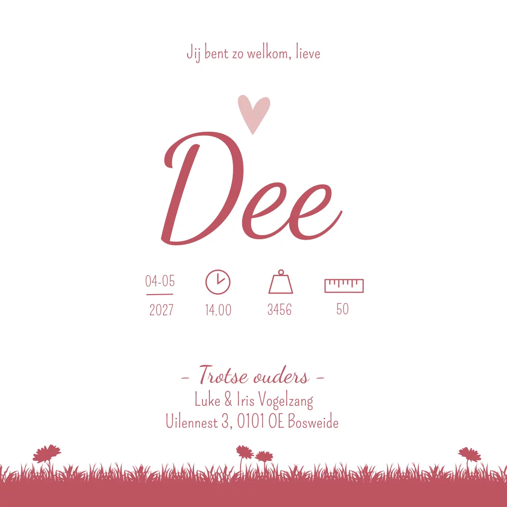 Een roze gewolkt geboortekaartje met een meisje op een fiets, een hond en een boom onder een boog van hartjes. Heb je liever een poes op het geboortekaartje in plaats van een hond? Dat kan! Geboortekaartje Dee is een illustratiekaart waarbij je de illustraties eenvoudig zelf kunt aanpassen in de editor. Kom je er niet uit? Neem gerust contact met ons op, we helpen je graag!