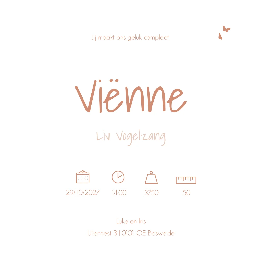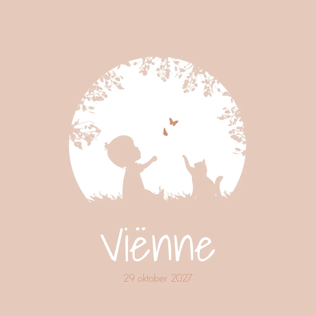 Een lief lichtroze geboortekaartje met een meisje en haar kat die samen spelen in het gras met vlindertjes. Wil je graag op kaartje Viënne een ander huisdier? Neem dan een kijkje in onze editor voor alle opties.