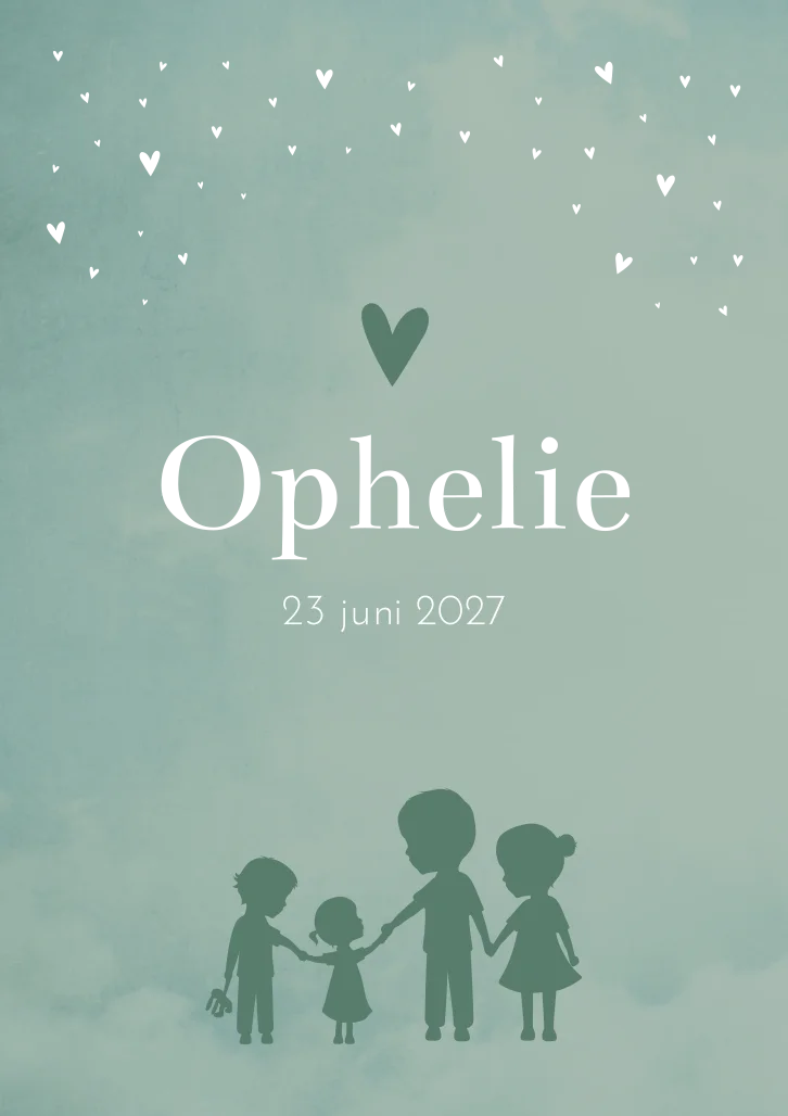 Superlief illustratiekaartje van twee grote broers en een zus die hun kleine zusje aan de hand houden en verwelkomen in het gezin. De kleur van kaart Ophelie is mint groen/ blauw van kleur en kan aangepast worden naar iedere gewenste kleur. De hartjes en naam in goudfolie maken het kaartje extra chique. Wil je dit liever aanpassen naar een andere folie kleur of liever geheel zonder foliedruk? Dat is ook mogelijk! Je past dit ontwerp geheel zelf en heel makkelijk en snel aan in onze editor! Wil je liever een andere illustratie/ gezinssamenstelling? Dit kun je ook in de editor vinden. Staat jouw combinatie er niet bij? Stuur ons dan een mailtje, dan maken wij het voor je!