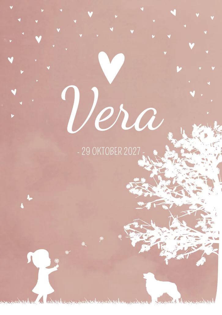 Een roze gewolkt geboortekaartje met een boom, hartjes hondje en een meisje wat paardenbloemenpluisjes wegblaast. Kaartje Vera is een romantisch kaartje wat extra speciaal wordt als je de naam laat drukken in koperfolie. Heb jij een andere gezinssituatie? Pas het kaartje dan gemakkelijk aan in onze editor!