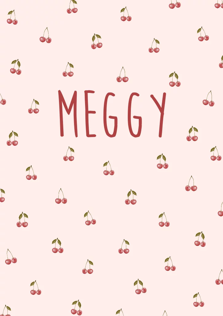 Een zoet geboortekaartje met een patroon van kersen. Perfect om de geboorte van een lief klein meisje aan te kondigen. De kaart Meggy pas je gemakkelijk naar je wensen aan in de editor!