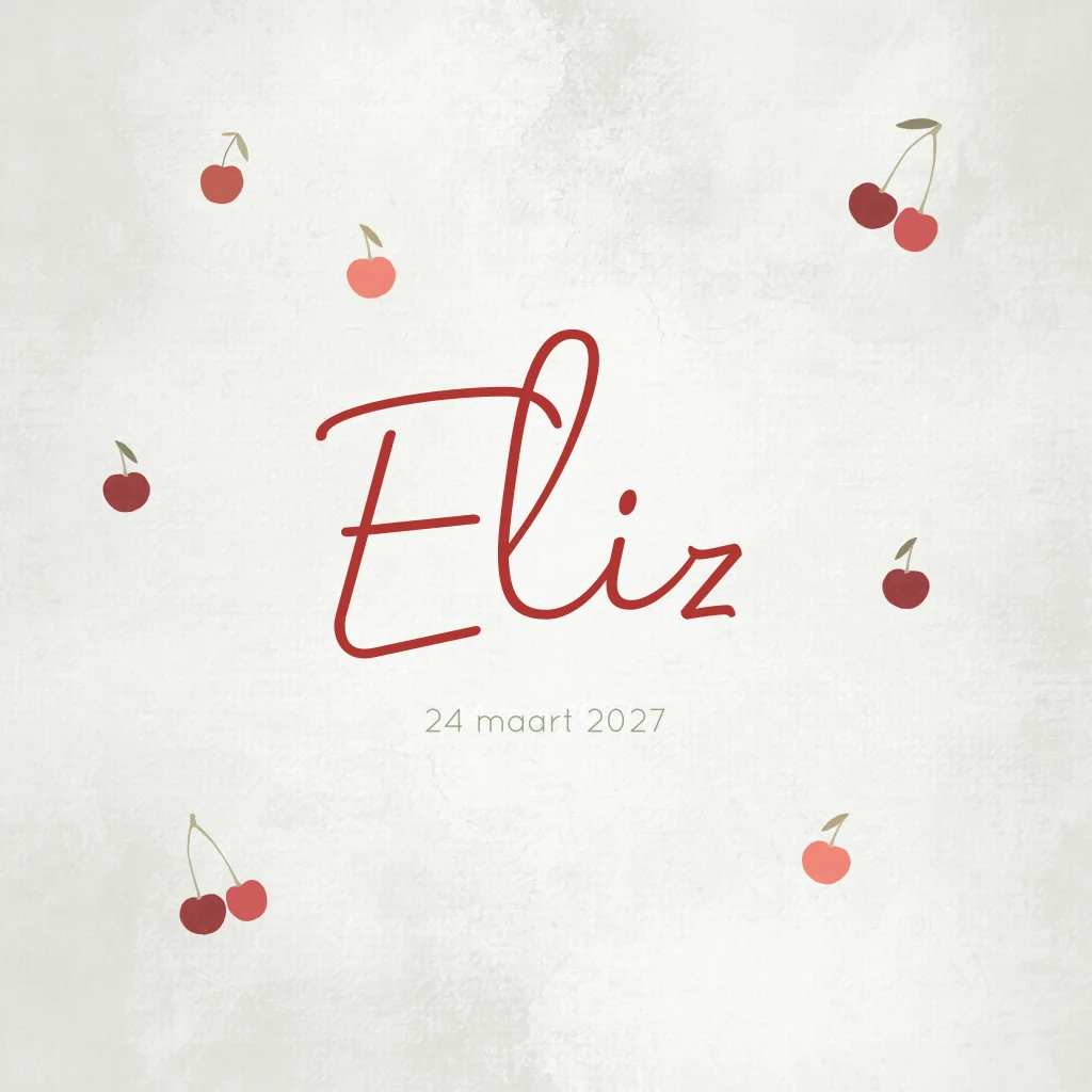 Lief en zoet geboortekaartje Eliz voor een meisje, met rode kersen op een licht beige achtergrond. Je past de kaart helemaal zelf aan in de editor.