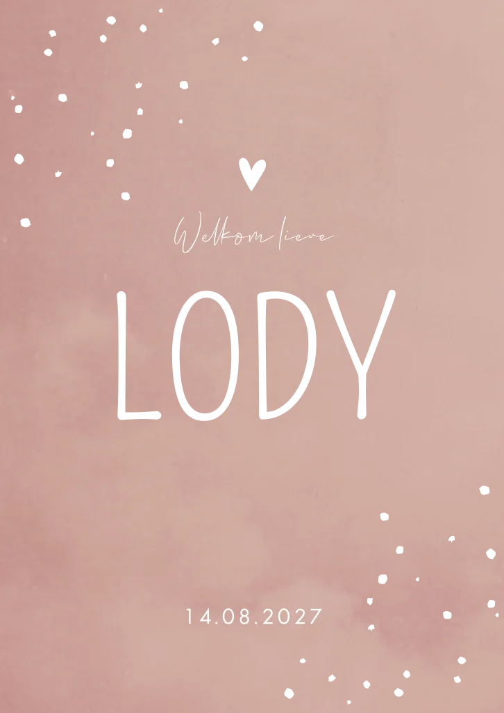 Een oudroze gewolkt geboortekaartje met stipjes en hartjes. Kaartje Lody is ontzettend mooi als je deze laat drukken met koperfolie. Wil je graag iets aanpassen? Neem dan een kijkje in onze editor.