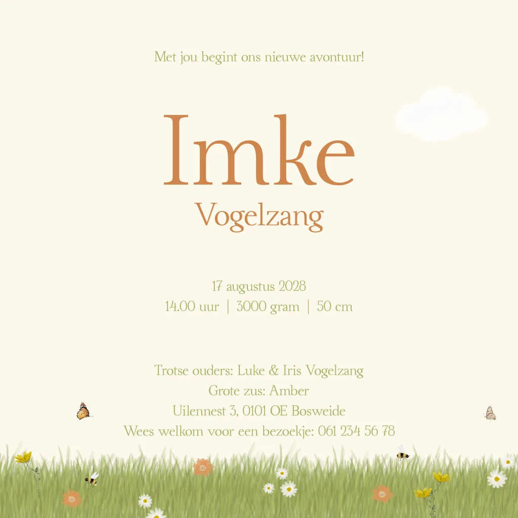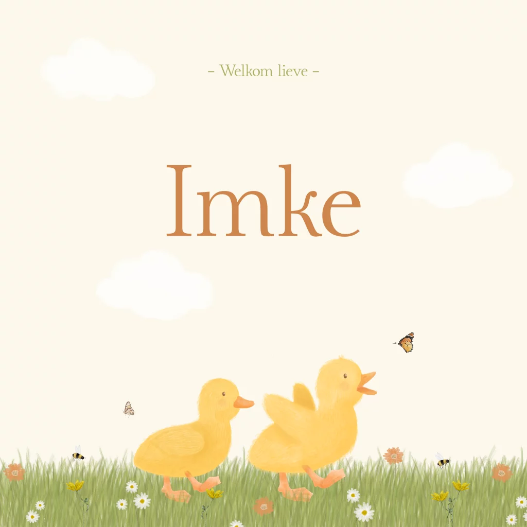 Een vrolijk kaartje voor een klein kuikentje. Op het kaartje Imke zijn twee eendjes, gras, bloemen en bijtjes te zien. Je past het kaartje heel gemakkelijk aan in de editor. Daar is het ook mogelijk om een eendje te verwijderen of toe te voegen.