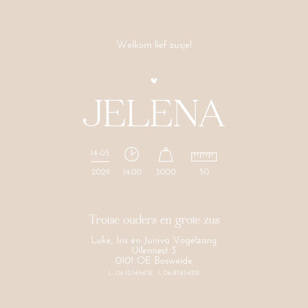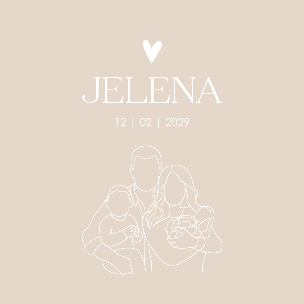 Een lief en tijdloos hip geboortekaartje Jelena in een zacht roze kleur met koperfolie voor de namen en de lijntekening van het gezin. Wil je graag iets aanpassen? Neem dan een kijkje in onze editor voor de vele opties!
