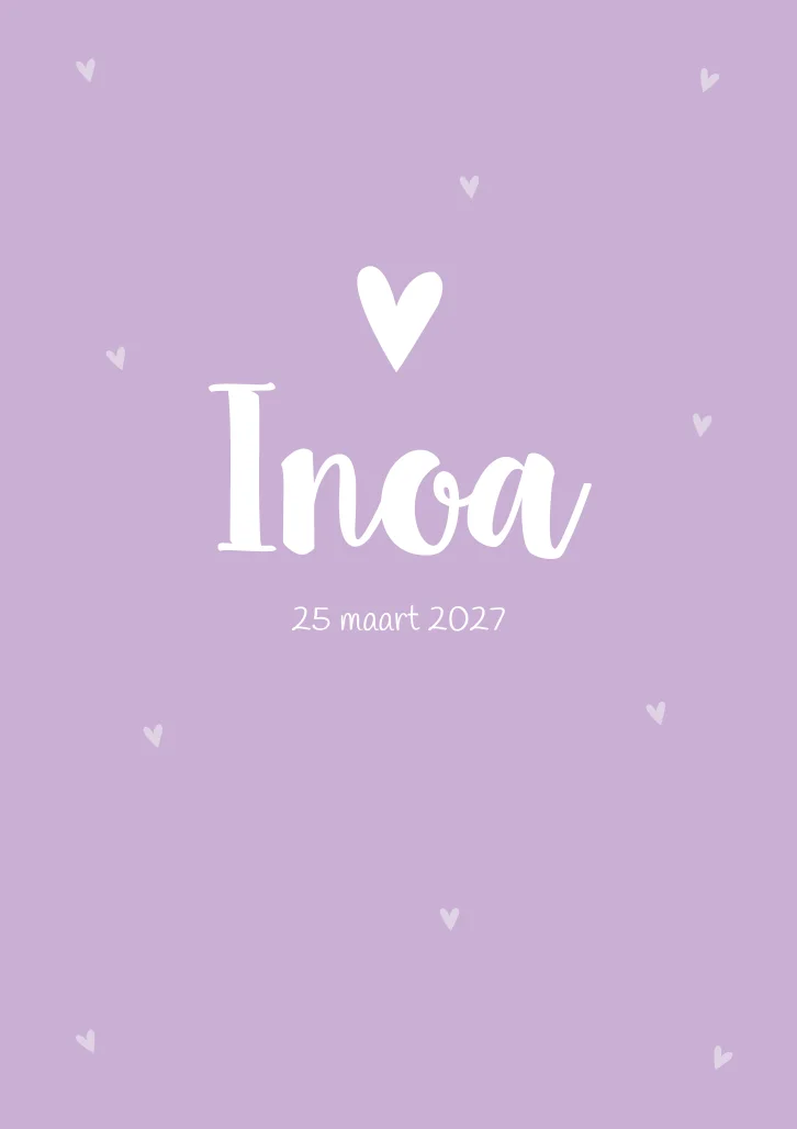Een lief geboortekaartje met licht lila hartjes. Kaartje Inoa heeft een trendy lila kleur. Wil je graag iets aanpassen? Neem dan een kijkje in onze editor voor alle opties.