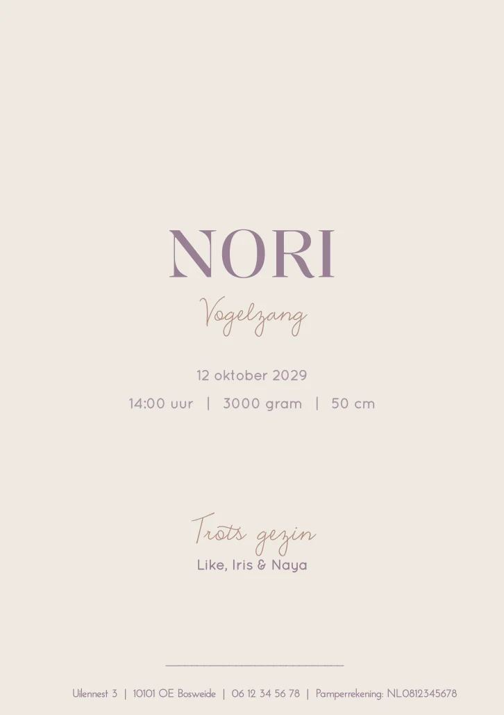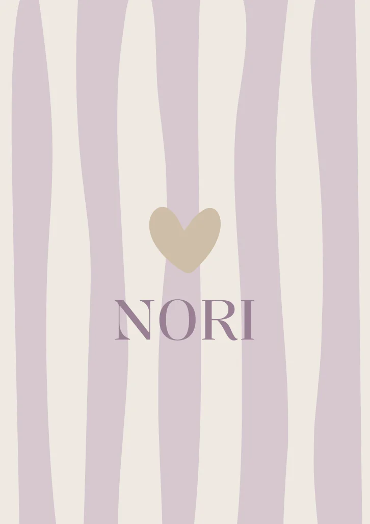 Geboortekaartje Nori is een lief gestreept kaartje met beige achtergrond. De kleuren zijn eenvoudig naar eigen wens aan te passen in de editor.