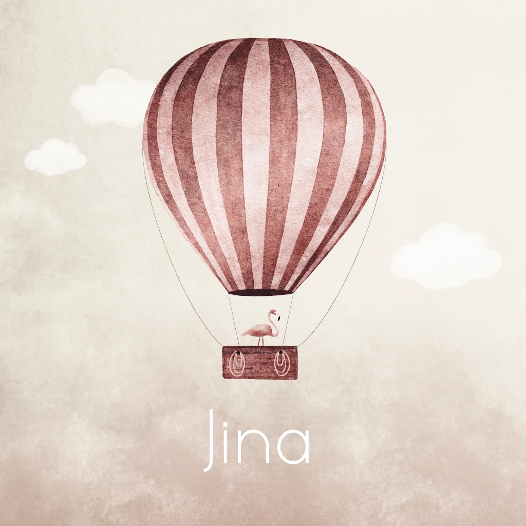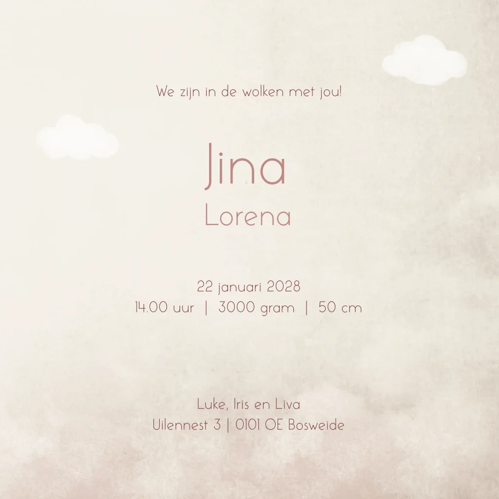 Beige/ zacht roze gewolkt geboortekaartje. Geboortekaartje Jina is een lief stijlvol en warm geboortekaartje met wok effect en wolkjes met een luchtballon in roze kleur met een flamingo diertje. Maak het kaartje extra bijzonder door het te laten bedrukken met roséfolie.