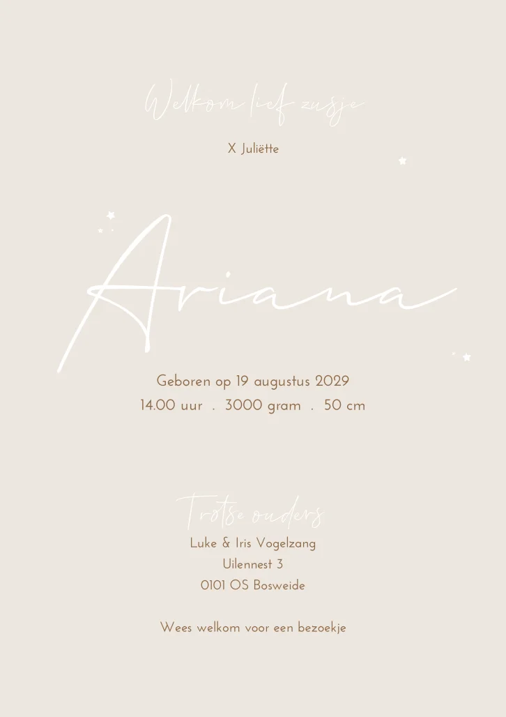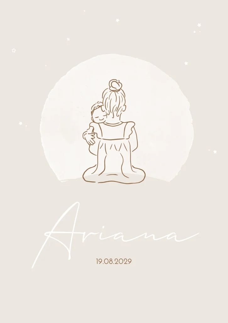 Een beige geboortekaartje in naturel tinten met donkerbruin. Op kaartje Ariana is een lijntekening van een grote zus, kleine zus en baby zusje te zien. Ziet jouw gezin er anders uit? In onze beeldbank kun je veel meer soorten lijntekeningen vinden.