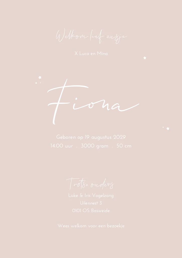 Een zacht roze geboortekaartje met een witte maan. Op kaartje Fiona is een silhouet van een grote broer, kleine zus en baby zusje te zien. Ziet jouw gezin er anders uit? In onze beeldbank kun je veel meer soorten lijntekeningen vinden.