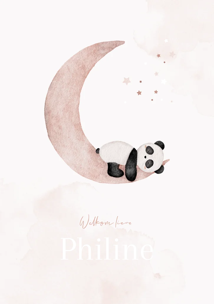 Love you to the moon and back! Een lichtroze geboortekaartje met een waterverf illustratie van een schattig slapend pandabeertje op de maan. Het pandabeertje wordt omringd door kleine sterretjes en op de achtergrond zie je waterverfvlekken. Kaartje Philine is erg mooi door de toevoeging van de roséfolie. Liever een kaartje zonder foliedruk? Kies dan voor gebobbeld papier, zo lijkt de illustratie net echt geschilderd.