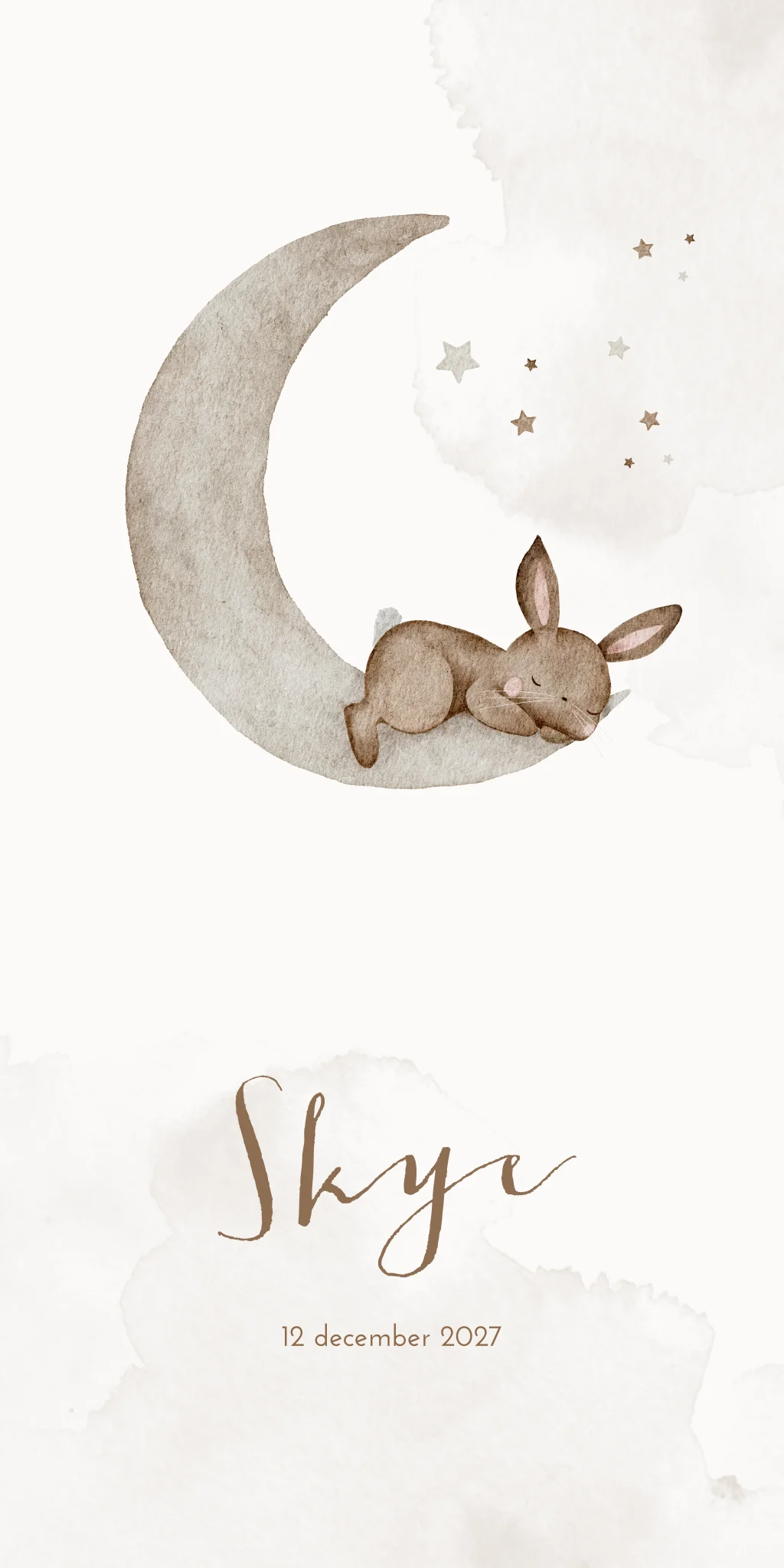 Love you to the moon and back! Een neutraal beige geboortekaartje met een waterverf illustratie van een schattig slapend konijntje op de maan. Het konijntje wordt omringd door kleine sterretjes en op de achtergrond zie je waterverfvlekken. Kaartje Skye is prachtig op gebobbeld papier, maar ook erg mooi met foliedruk. Tip: Kies je voor foliedruk? Dan is het extra mooi om een aantal sterretjes ook in folie af te laten drukken.