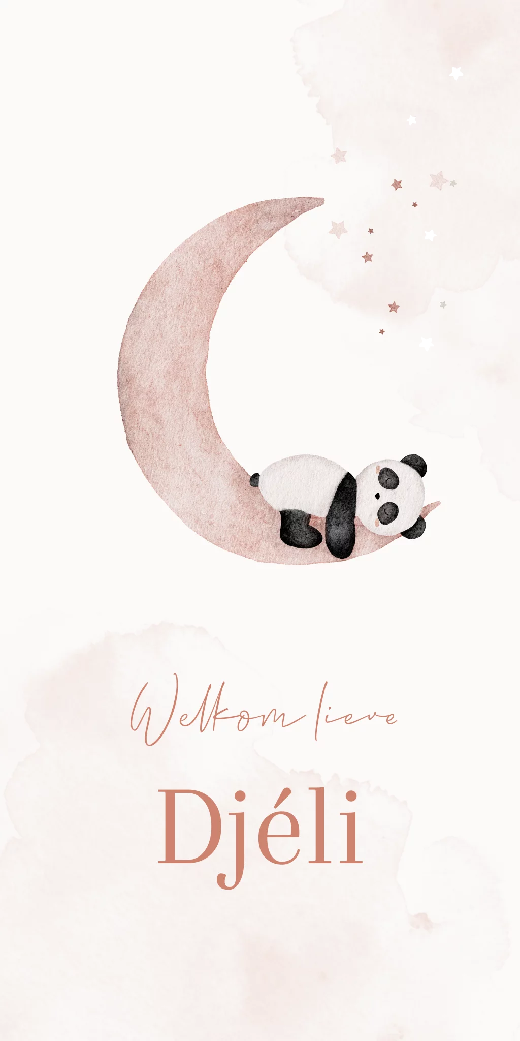 Love you to the moon and back! Een zacht roze dromerig geboortekaartje met een waterverf illustratie van een schattig slapend pandabeertje op de maan. Het panda beertje wordt omringd door kleine sterretjes en op de achtergrond zie je waterverfvlekken. Kaartje Djéli is prachtig op gebobbeld papier, maar ook erg mooi met roséfoliedruk. Tip: Kies je voor foliedruk? Dan is het extra mooi om een aantal sterretjes ook in folie af te laten drukken.