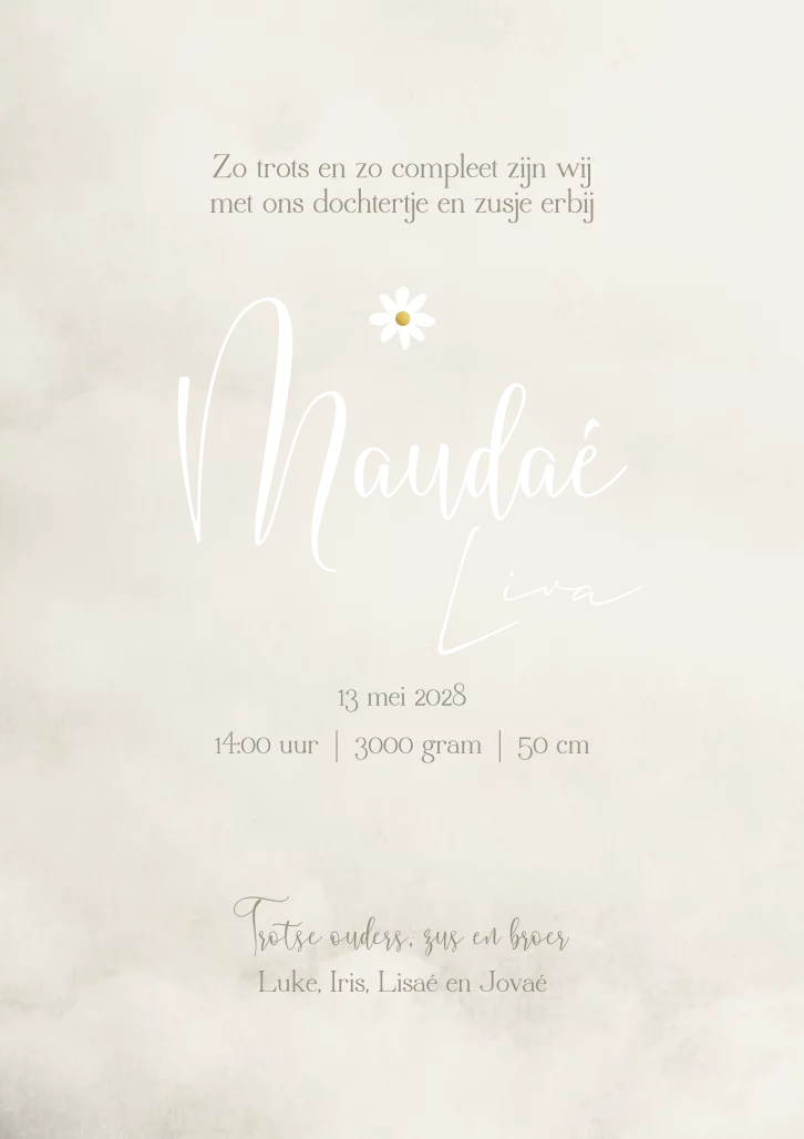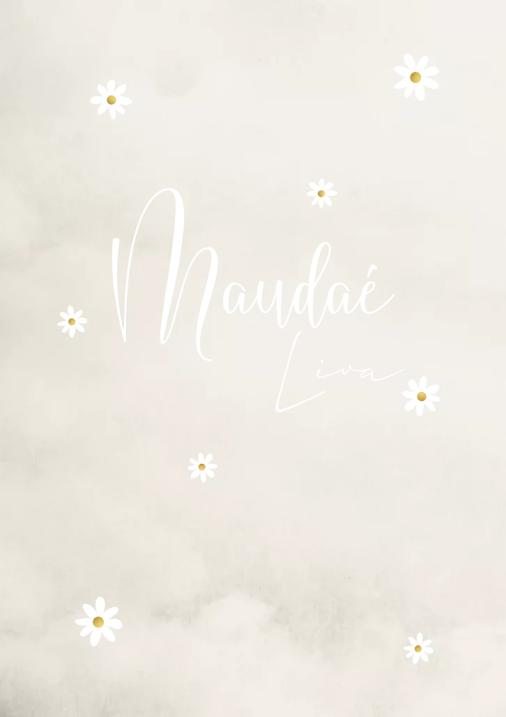 Beige crème gewolkt geboortekaartje met madeliefjes bloemetjes. Dit vrolijke lente Geboortekaartje Maudaé is een neutraal en strak/modern geboortekaartje. Maak het kaartje extra bijzonder door het te laten bedrukken met goudfolie. Je past hem helemaal zelf aan in de editor!