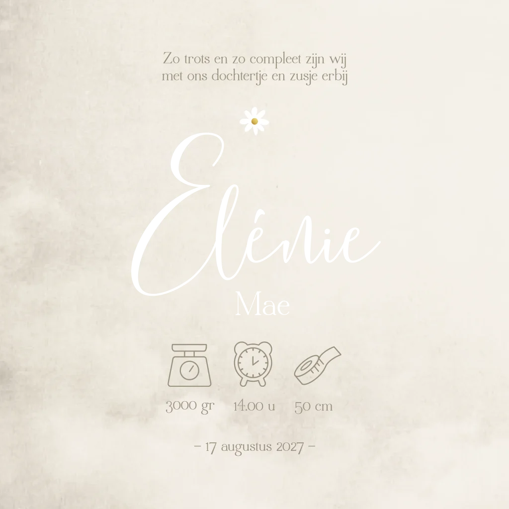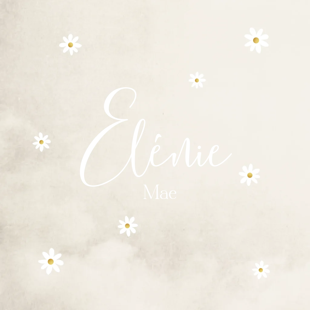 Beige crème gewolkt geboortekaartje met madeliefjes bloemetjes. Dit vrolijke lente Geboortekaartje Elénie is een neutraal en strak/modern geboortekaartje. Maak het kaartje extra bijzonder door het te laten bedrukken met goudfolie. Je past hem helemaal zelf aan in de editor!