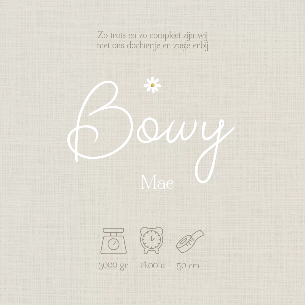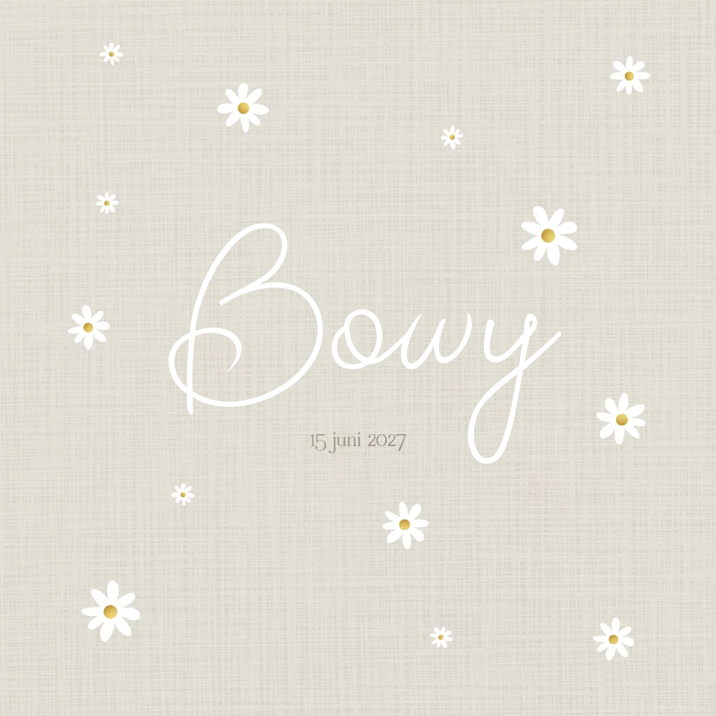 Beige geboortekaartje in linnen-look met madeliefjes bloemetjes. Dit vrolijke lente Geboortekaartje Bowy is een neutraal en strak/modern geboortekaartje. Maak het kaartje extra bijzonder door het te laten bedrukken met goudfolie. Je past hem helemaal zelf aan in de editor!