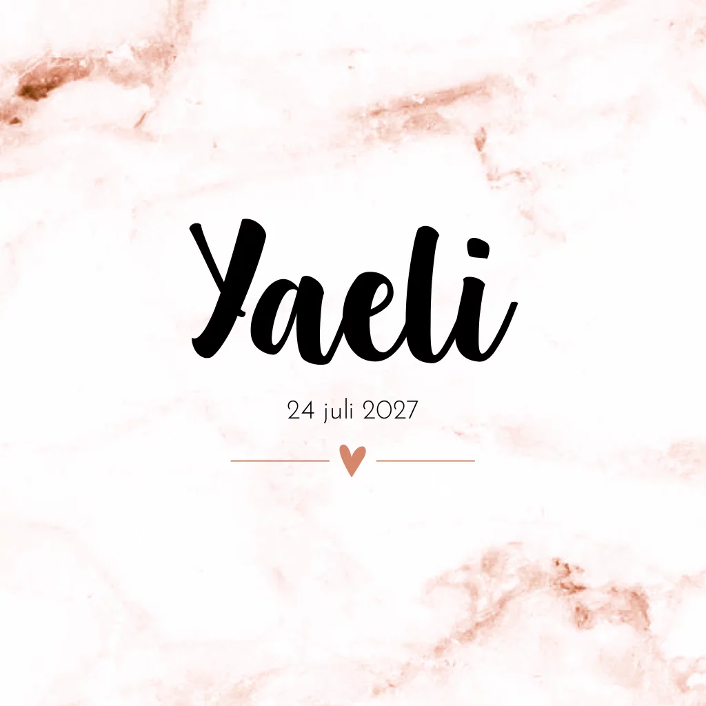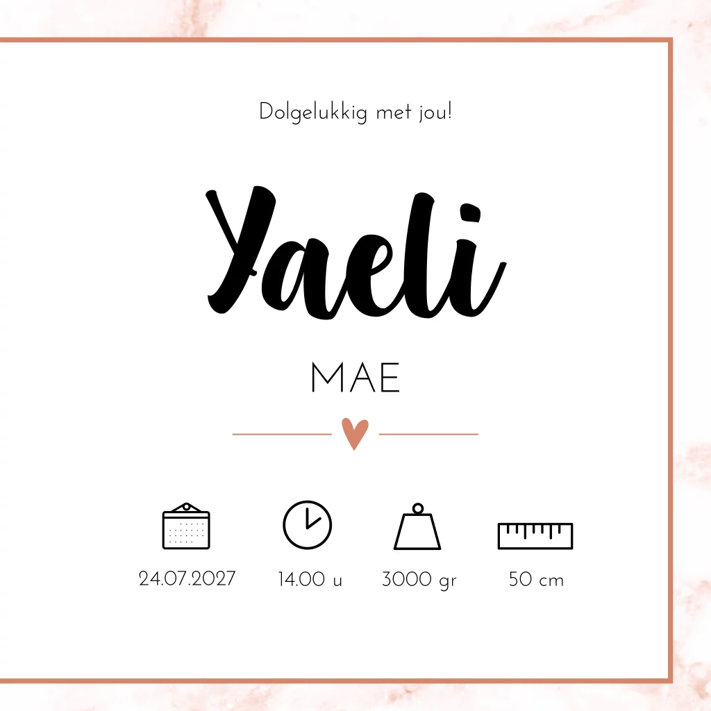 Geboorte kaart met roze marmeren achtergrond. Kaartje Yaeli is een stoer geboortekaartje. Door het zwart met marmer te combineren krijgen je een bijzondere mix tussen stoer en romantisch.