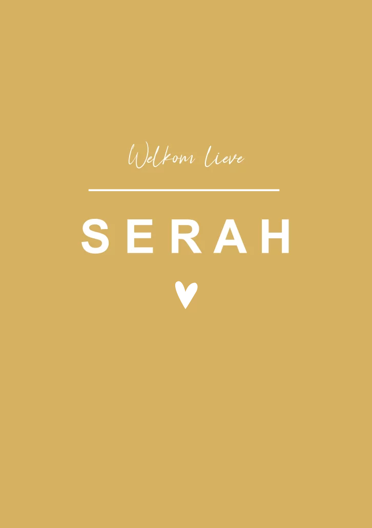 Stoere okergele geboortekaart Serah met witte letters en koperfolie als afwerking. Het hartje kun je aanpassen naar een andere vorm als je dat wilt en zo zijn ook de kleuren van de kaart en de lettertypes aanpasbaar in onze editor.