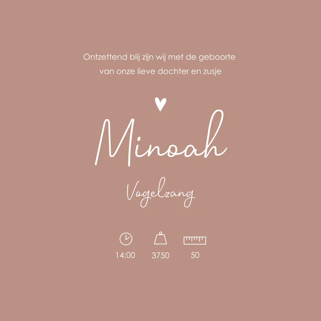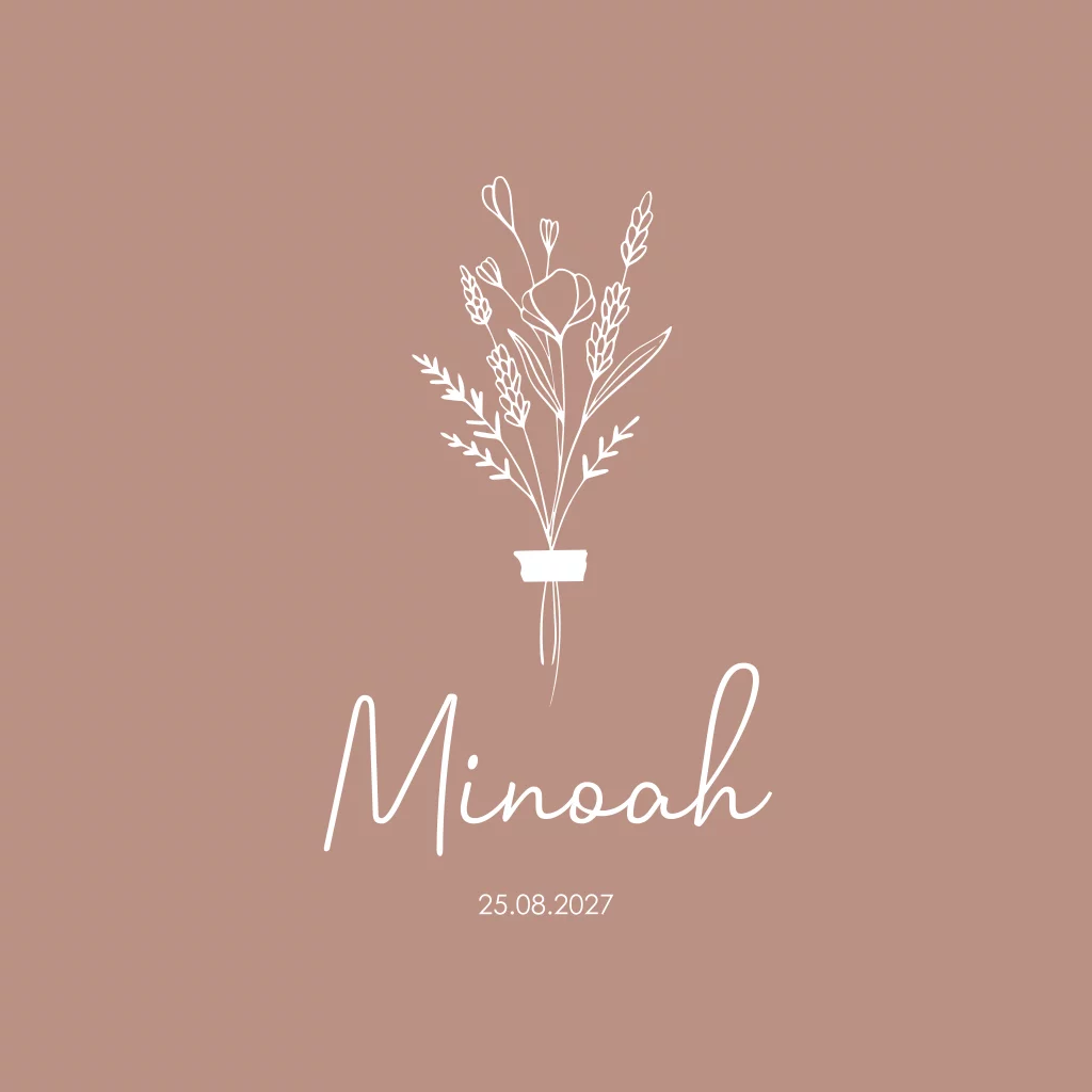 Een oudroze geboortekaartje met een lief geïllustreerd bosje bloemen. Wil je de kaart aanpassen in bijvoorbeeld de kleur van de babykamer? Geen probleem, je past de kleur van kaartje Minoah eenvoudig aan in de editor.
