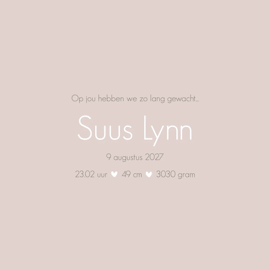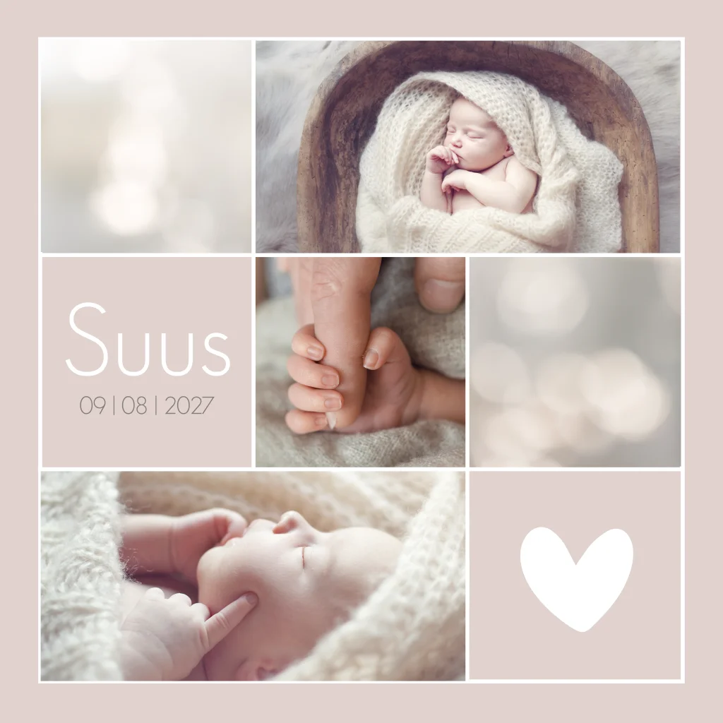 Een mooi strak geboortekaartje met ruimte voor veel foto's van de kleine meid. De voorbeeldfoto's op het kaartje Suus zijn gemaakt door mooiklein.nl. Je kunt je eigen foto's uploaden en aan de kaart toevoegen. Vergeet niet de witte lijnen bovenop de kaart te leggen in de editor voor een mooie afwerking.
