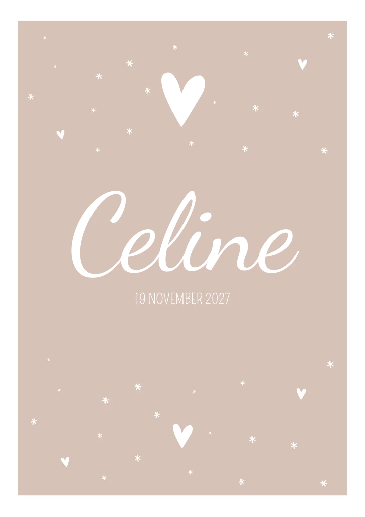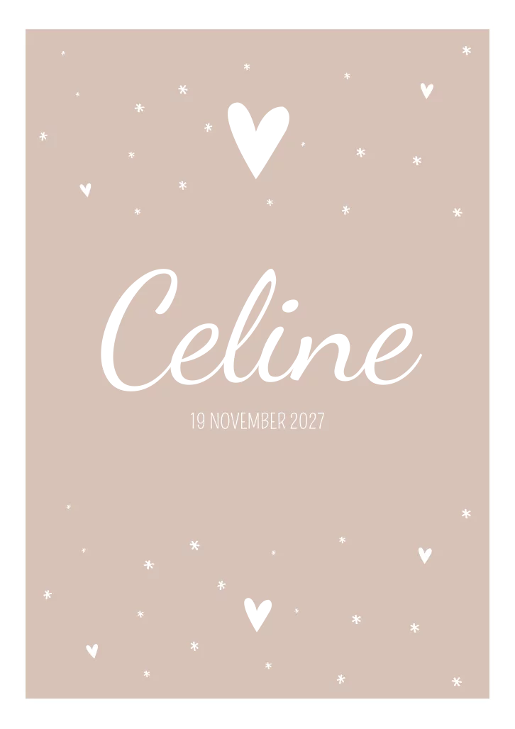 Een romantisch oudroze geboortekaartje met hartjes en sterretjes en een wit kader. De naam op kaartje Celine en hartjes staan in koperfolie. Zo glimt de naam je tegemoet!