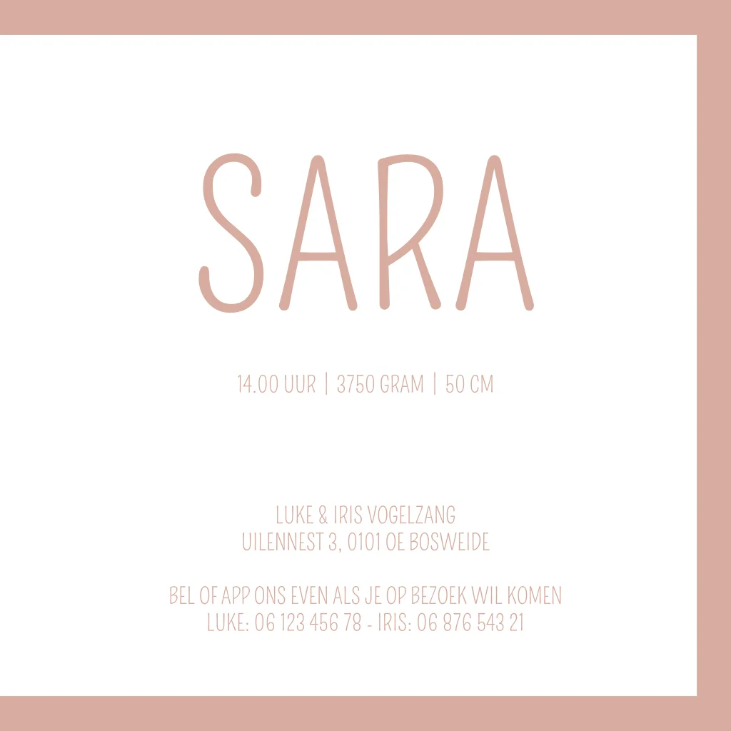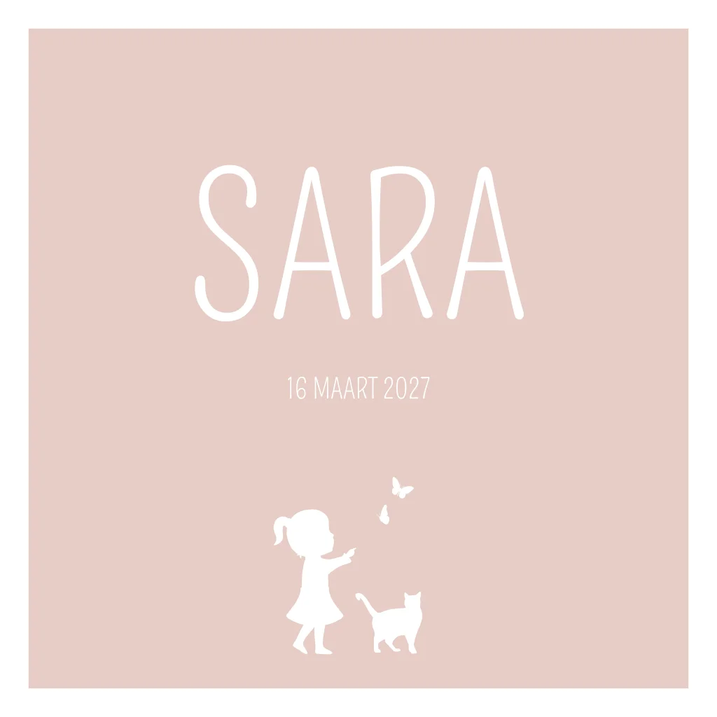 Oudroze geboortekaart met witte illustraties van een kindje, kat en vlinders. Verander de kleur en/of opmaak van geboortekaartje Sara eenvoudig in onze editor.