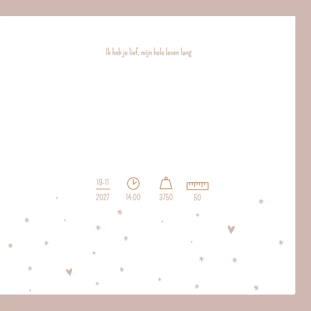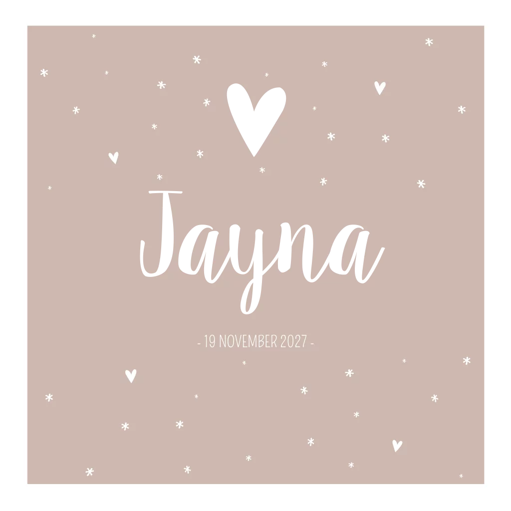 Oudroze geboorte kaartje met witte hartjes en sterretjes. Laat de naam en hartjes bedrukken met koperfolie voor een mooi effect. Geboortekaartje Jayna is ook mooi in roséfolie. Bekijk de verschillende opties in de editor!