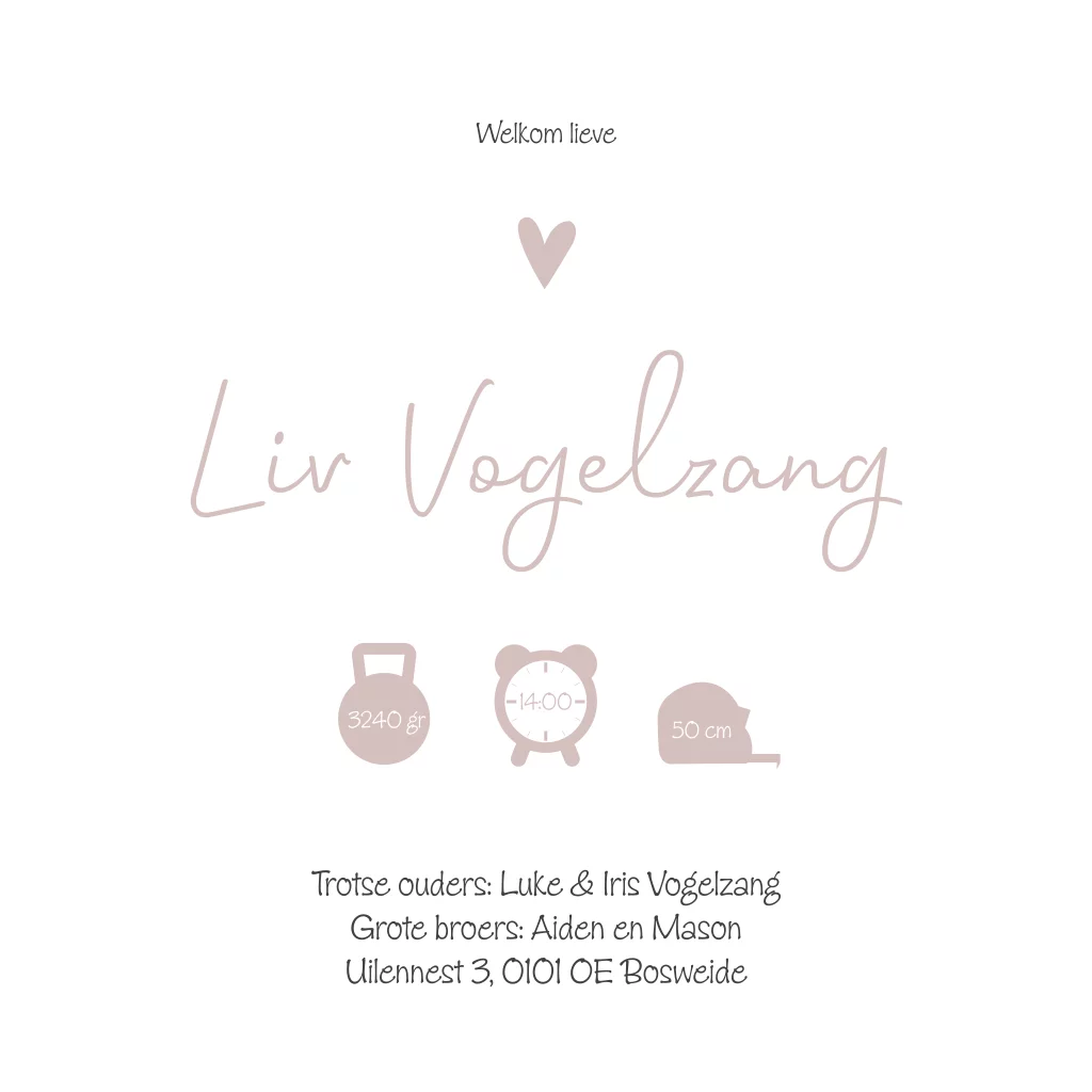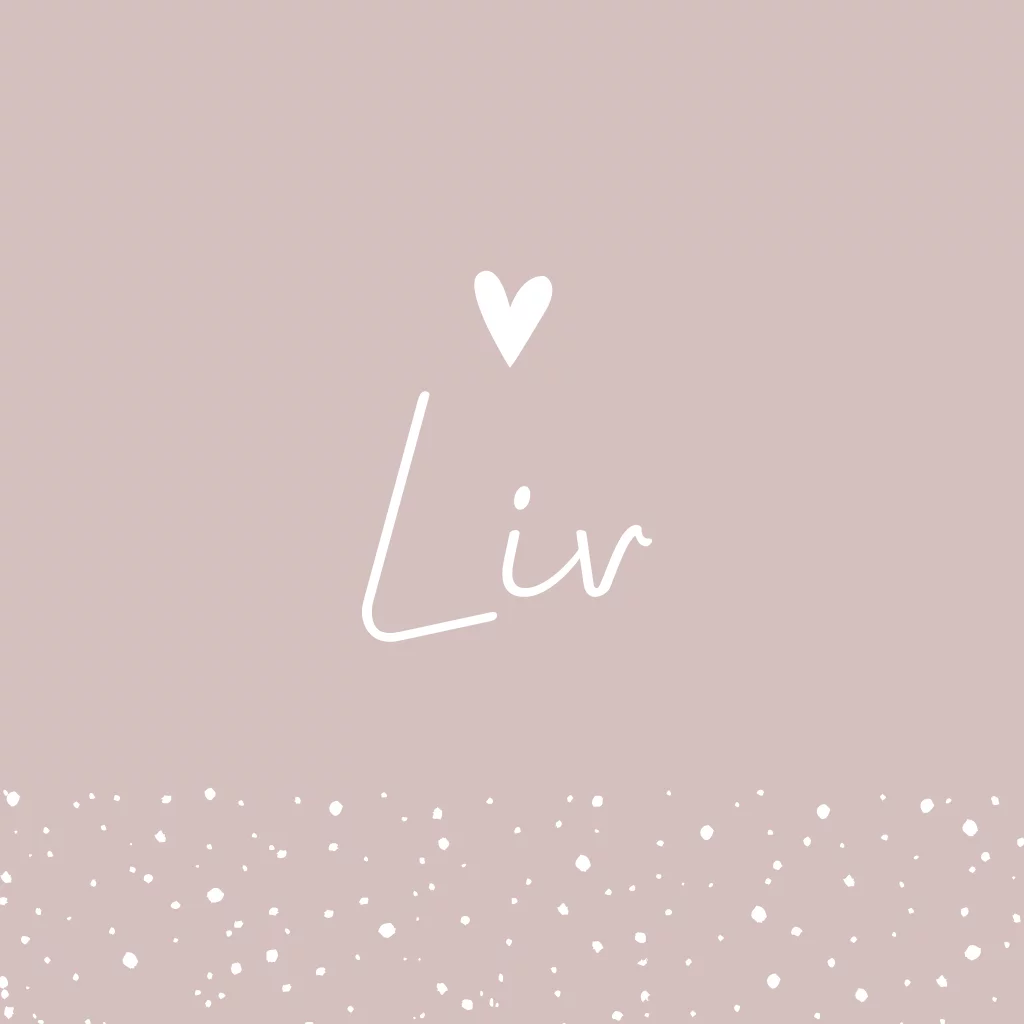 Oudroze geboortekaartje met stipjes en hartje. Geboortekaartje Liv is een romantisch, lief simplistisch kaartje. Pas het kaartje naar eigen wens aan in de editor.