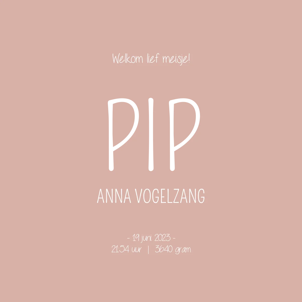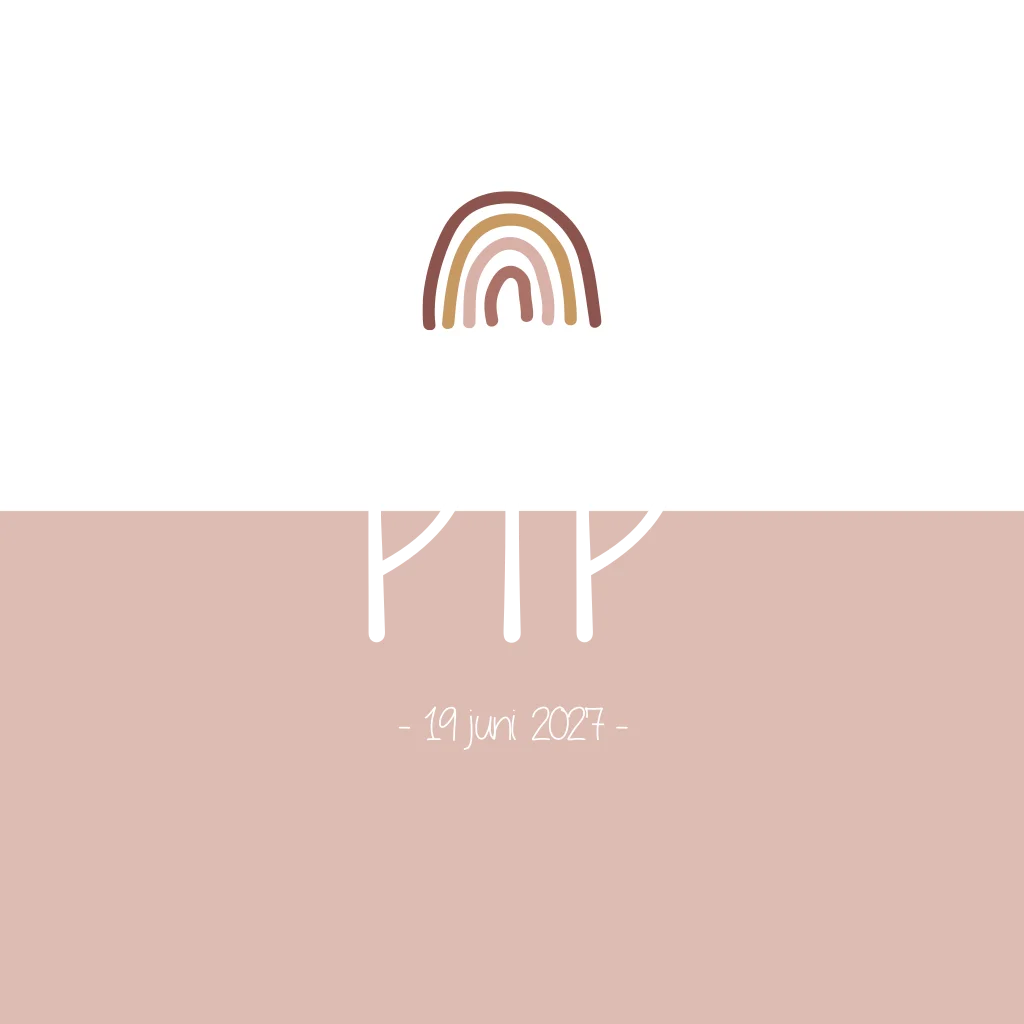 Een oudroze geboortekaartje met een lief regenboogje. De naam van kaartje Pip springt er extra uit door de koperfolie. Een goede combinatie tussen stoer en lief.