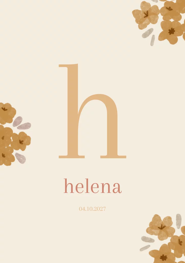 Een lief geboortekaartje met bloemen. Op kaartje Helena staat een initiaal op de voorzijde en grote bloemen. Er is gebruik gemaakt van gele en bruin tinten wat het kaartje ook perfect maakt voor de herfst. Een perfecte mix tussen stijlvol en speels! Wil je graag iets aanpassen? Neem dan een kijkje in onze editor voor alle opties.