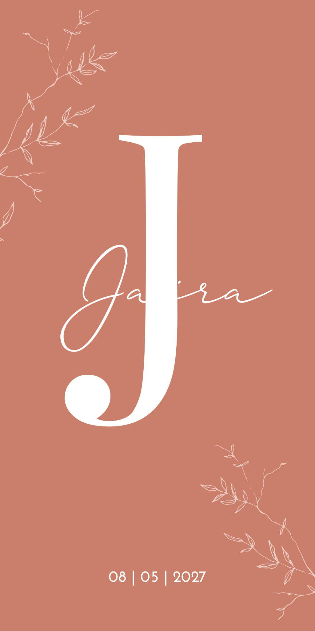 Een peach roze geboortekaartje met een grote letter als initiaal op de kaart. De speelse takjes maken het kaartje net wat sierlijker. Kaartje Jaïra is een modern en strakke kaart. Door de naam in goudfolie te drukken springt deze er extra uit! Wil je hem liever aanpassen qua kleur of opmaak? Dit doe je binnen enkele minuten in onze editor!