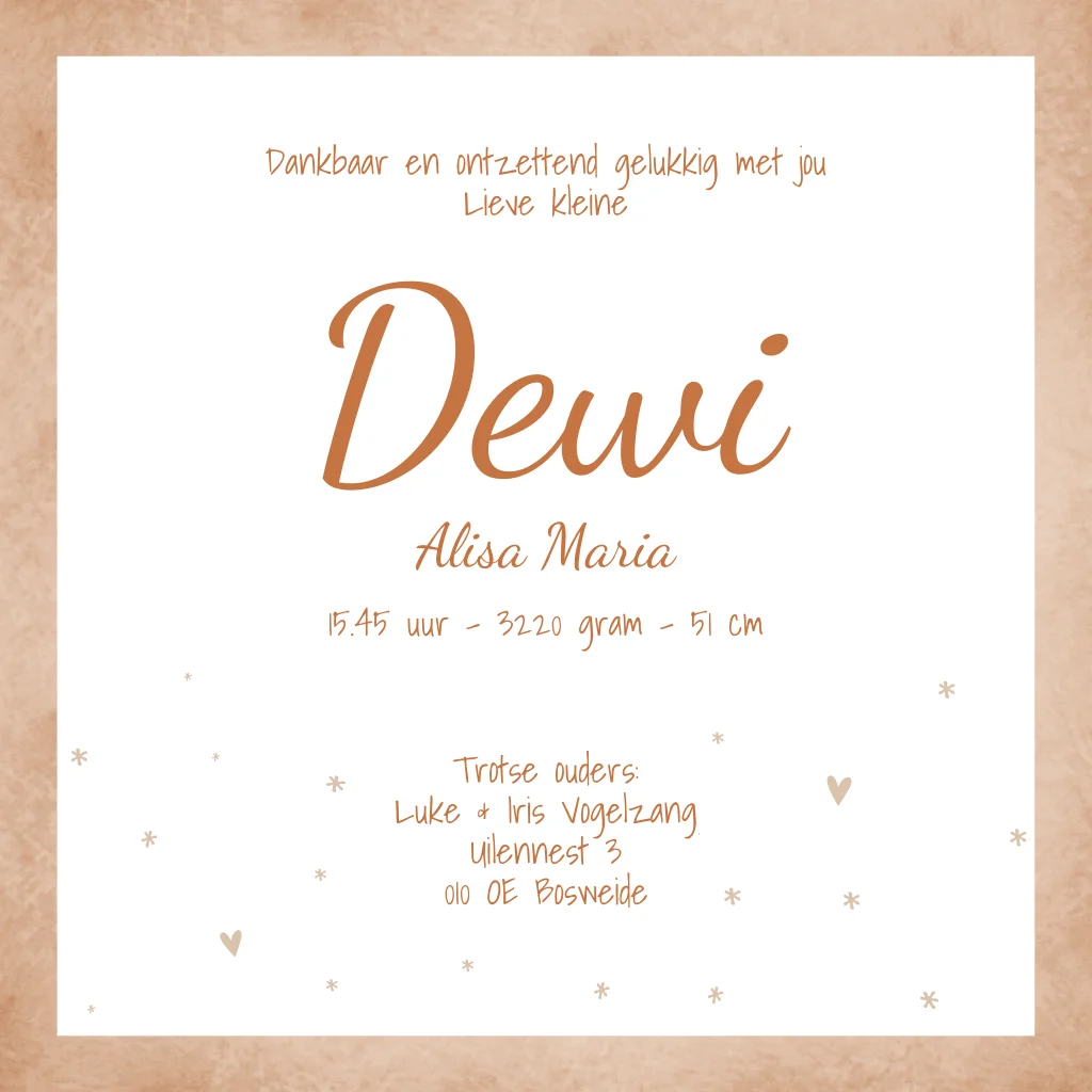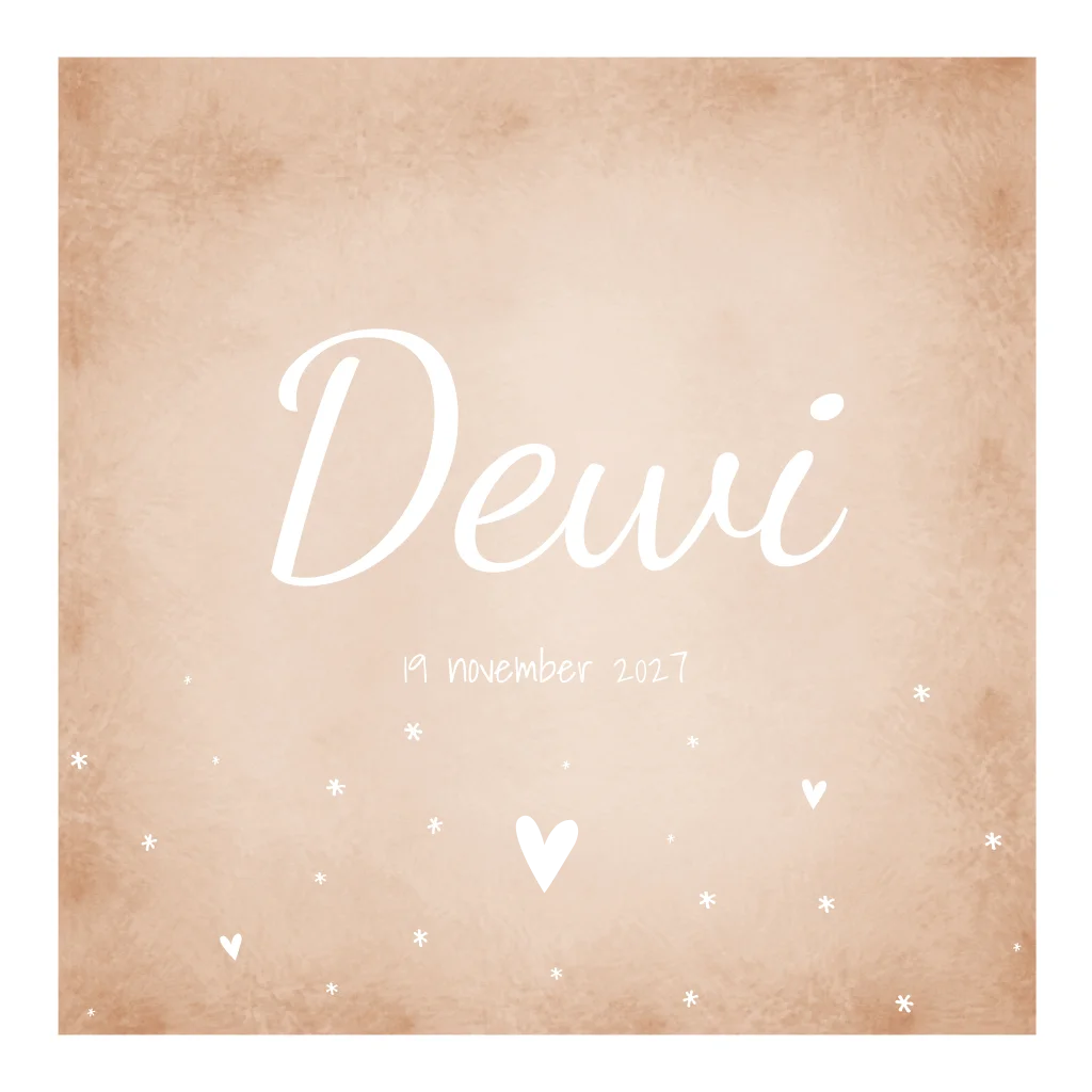 Peach/Roze geboortekaartje met witte naam en witte hartjes en sterretjes. Verander de kleur en/of opmaak van geboortekaartje Dewi eenvoudig in onze editor.