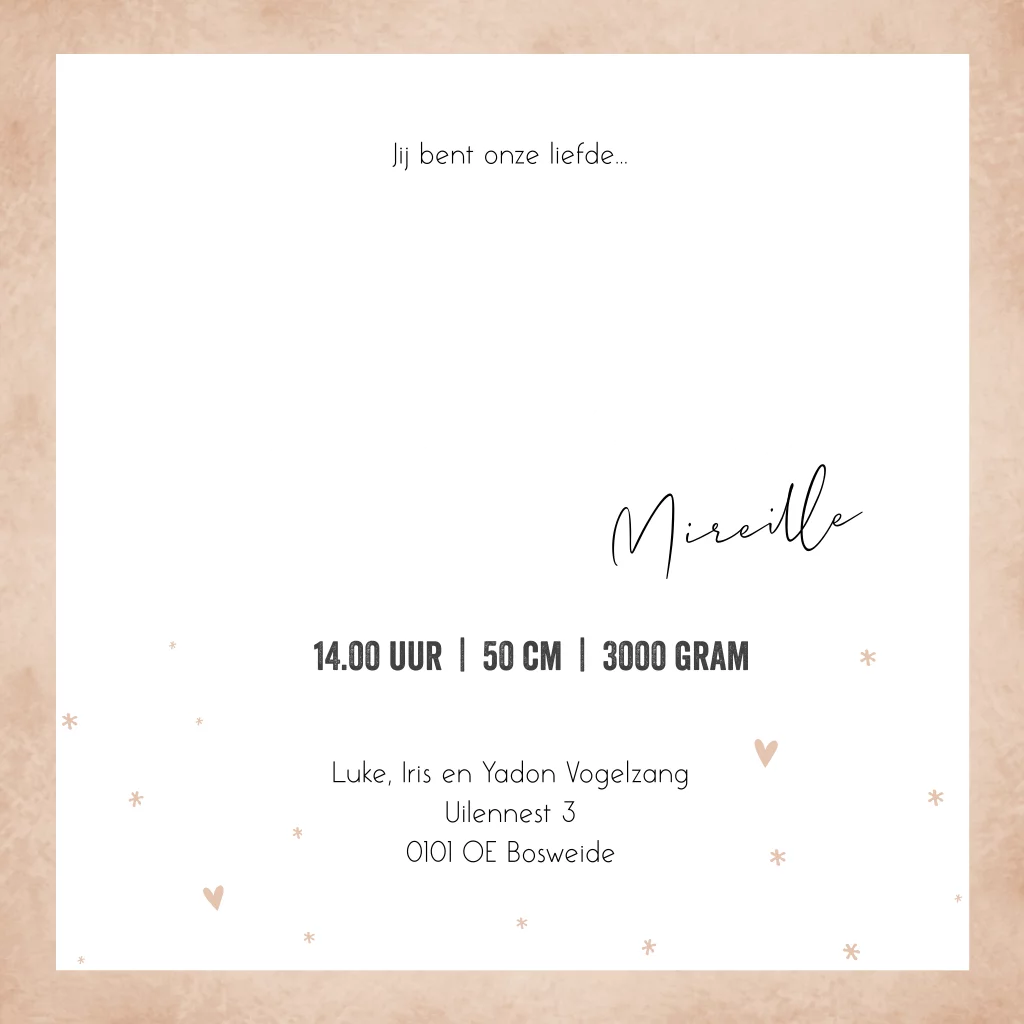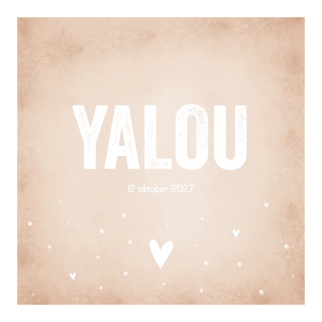 Een peachkleurig geboortekaartje met witte naam en witte sterretjes/hartjes. Geboortekaartje Yalou is een stoer geboortekaartje voor meisjes. Wil je dit kaartje liever in een andere kleur of opmaak? Je past het kaartje eenvoudig aan in onze editor.