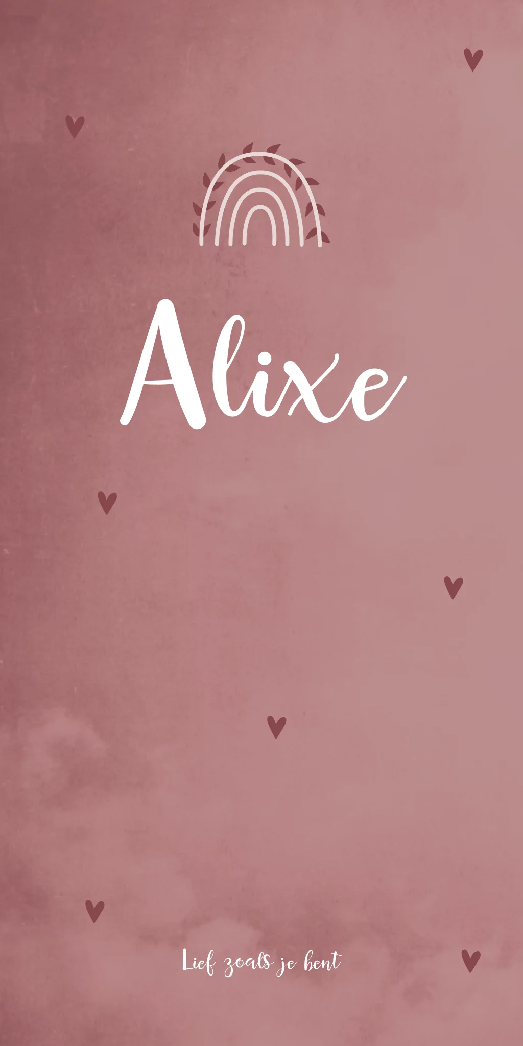 Een lief kaartje met een roze gewolkte achtergrond. Op kaartje Alixe staat op de voorzijde van de kaart een regenboogje met takjes. Om de kaart nog romantischer en liever te maken zijn er enkele hartjes op de kaart geplaatst. Een prachtig kaartje voor een groot wonder!