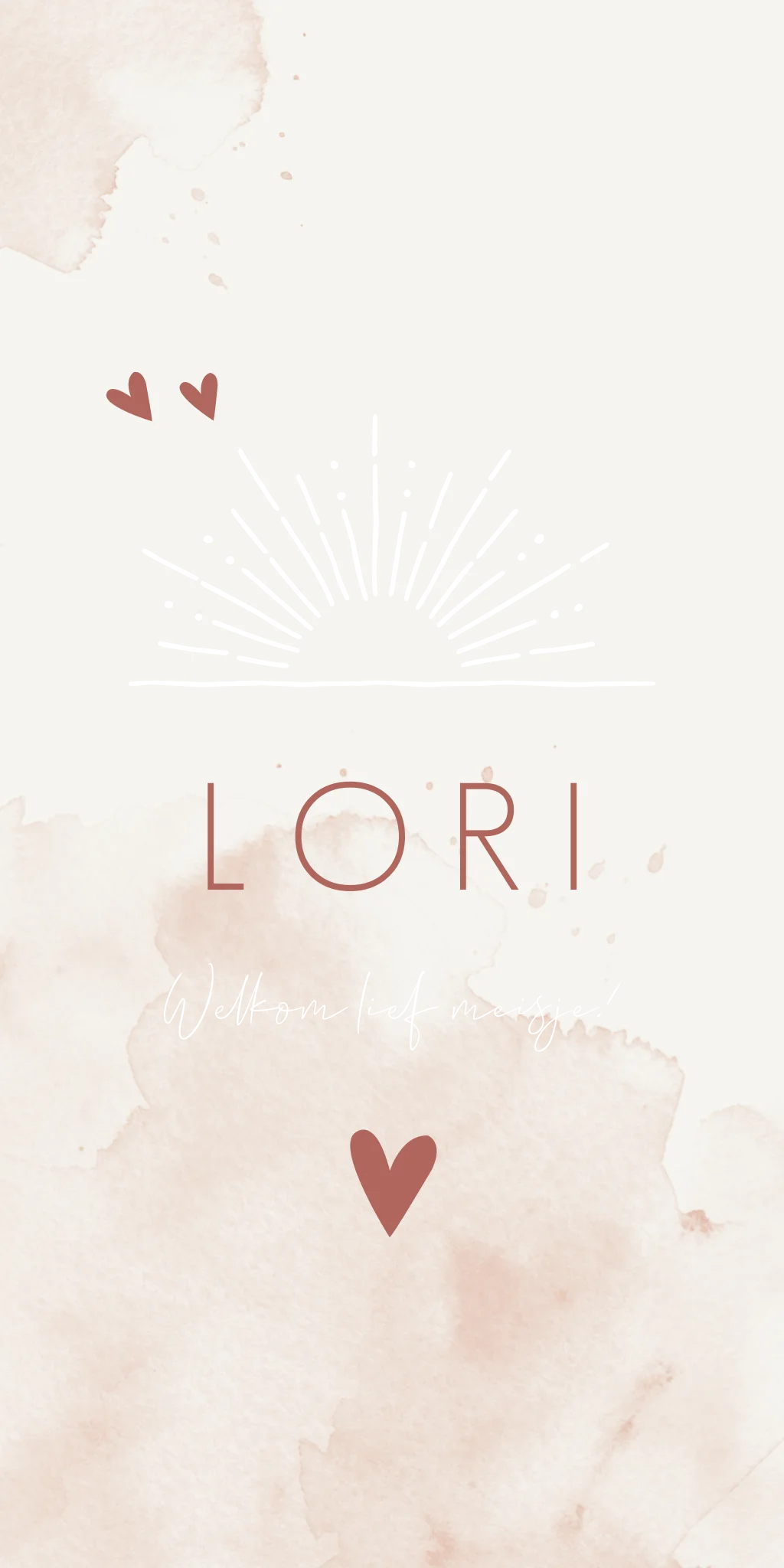 Een beige/ taupe kleurig babykaartje met roze waterverf vlekken en een lijntekening van een opkomende zon, gecombineerd met hartjes. Je past dit kaartje Lori zelf aan in onze editor en je kunt er een proefdruk van bestellen.