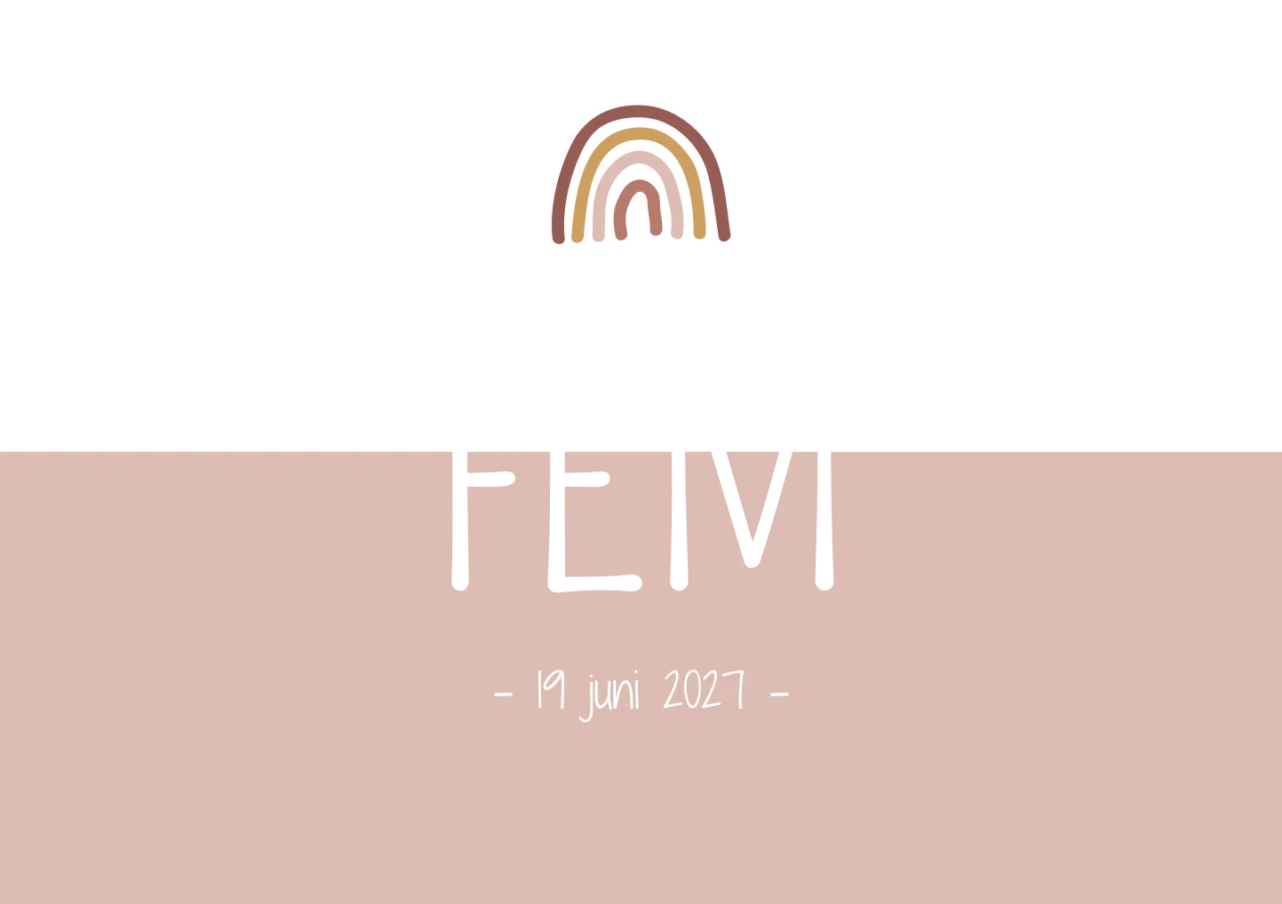 Een roze en wit geboortekaartje met een regenboogje. Kaartje Fem is een stoer en strak kaartje met een speelse touch. Wil je het kaartje nog specialer maken? Kies dan voor koperfolie of roséfolie voor de naam. Dan zal deze je tegemoet glimmen!
