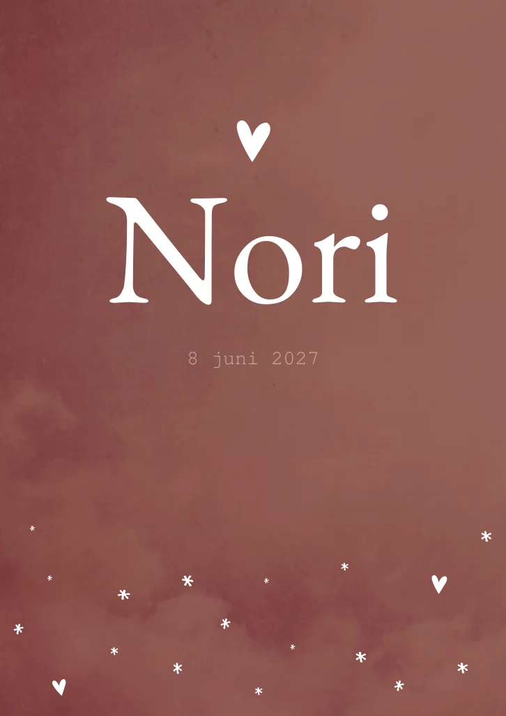 Een warm roestrood geboortekaartje met een gewolkte achtergrond. Kaartje Nori is een lief geboortekaartje en wordt nog mooier als je het kaartje laat drukken met koperfolie.