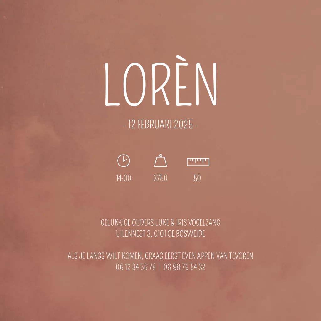 Een roest kleurige geboortekaart met veel illustraties van maantjes en sterren. Geboortekaartje Lorèn is ontzettend mooi wanneer je het laat bedrukken met goudfolie. De maan, sterren en andere details blinken dan op het kaartje.