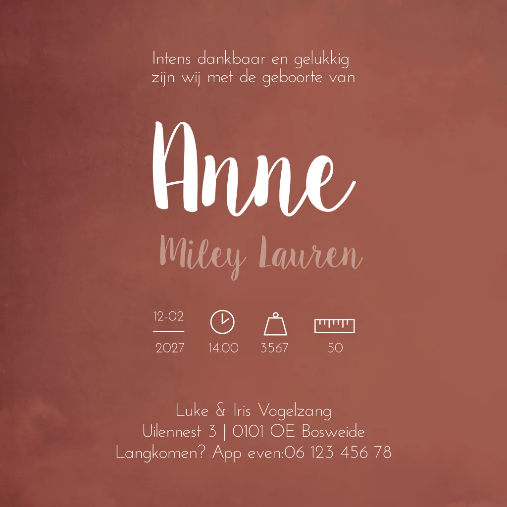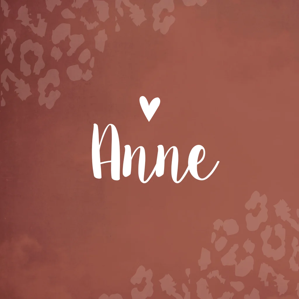 Een stoer geboortekaartje met een prachtig warme roestbruine tint. In de hoeken is een panterprint patroon geplaatst en om het kaartje wat romantischer te maken staan er enkele hartjes op het kaartje. Dit kaartje Anne zal prachtig zijn in combinatie met koperfolie.