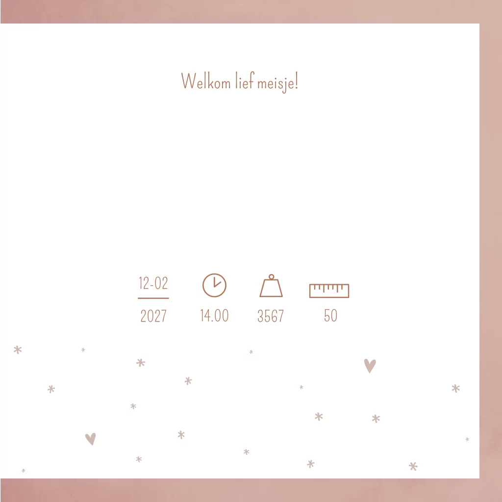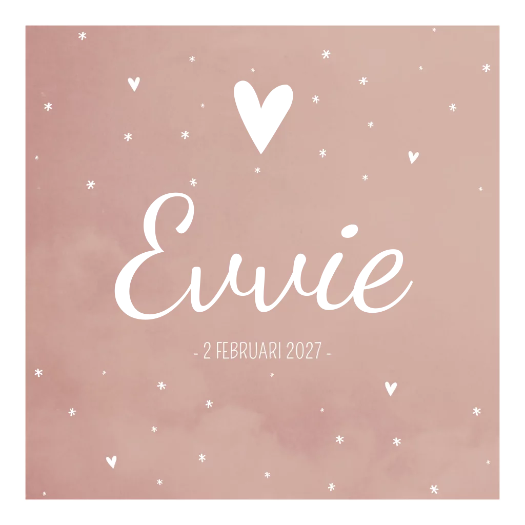 Dit oudroze kaartje Evvie heeft een mooie romantische uitstraling. De vele hartjes maken het echt een geboortekaartje voor een meisje. De bruine elementen op de kaart kunnen afgedrukt worden met koperfolie.