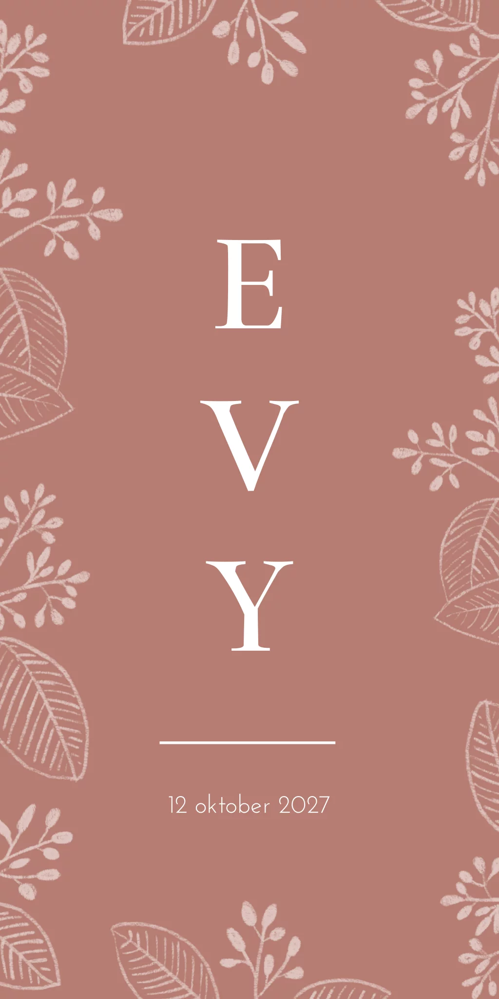 Een romantisch geboortekaartje in een donkere oudroze kleur. Op kaartje Evy staat de naam verticaal op de kaart en wordt deze omringd door getekende bloemen. Tip van de maker: Laat kaartje Evy op gebobbeld papier drukken, zo wordt het kaartje nóg mooier!